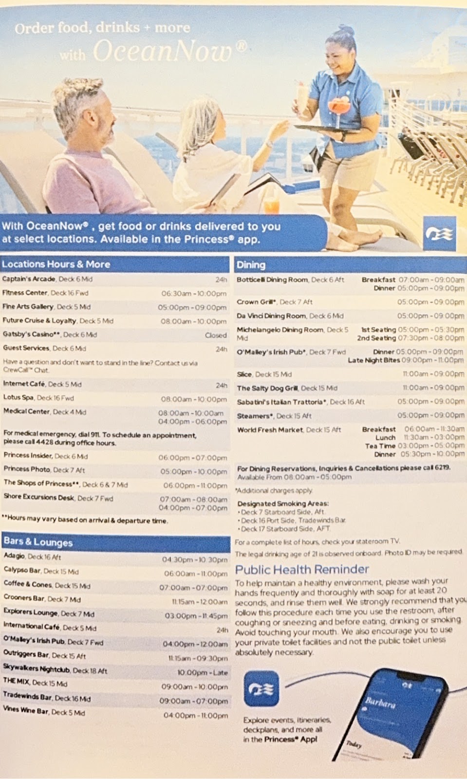 This was our SIXTH sea day in a row, but, really, if you don’t count turnaround day, it was my seventh in a row. If we’re getting tired of it, I’m can only imagine how sick the crew is of all of us. It’s like a mom with young kids…they’re always underfoot, they’re always demanding something (I need LIMES for my G&T) and the house is a mess. They sure are a patient bunch.