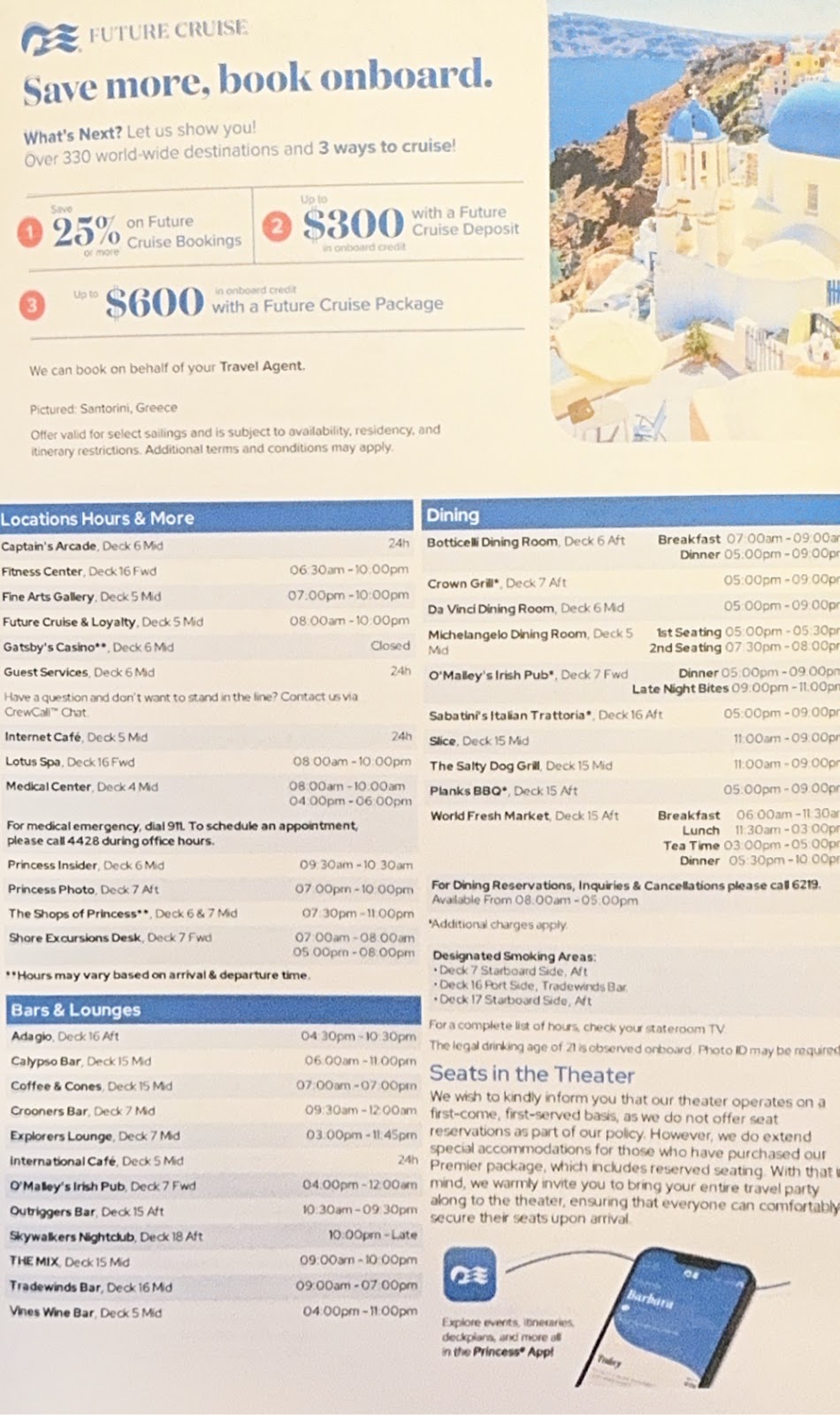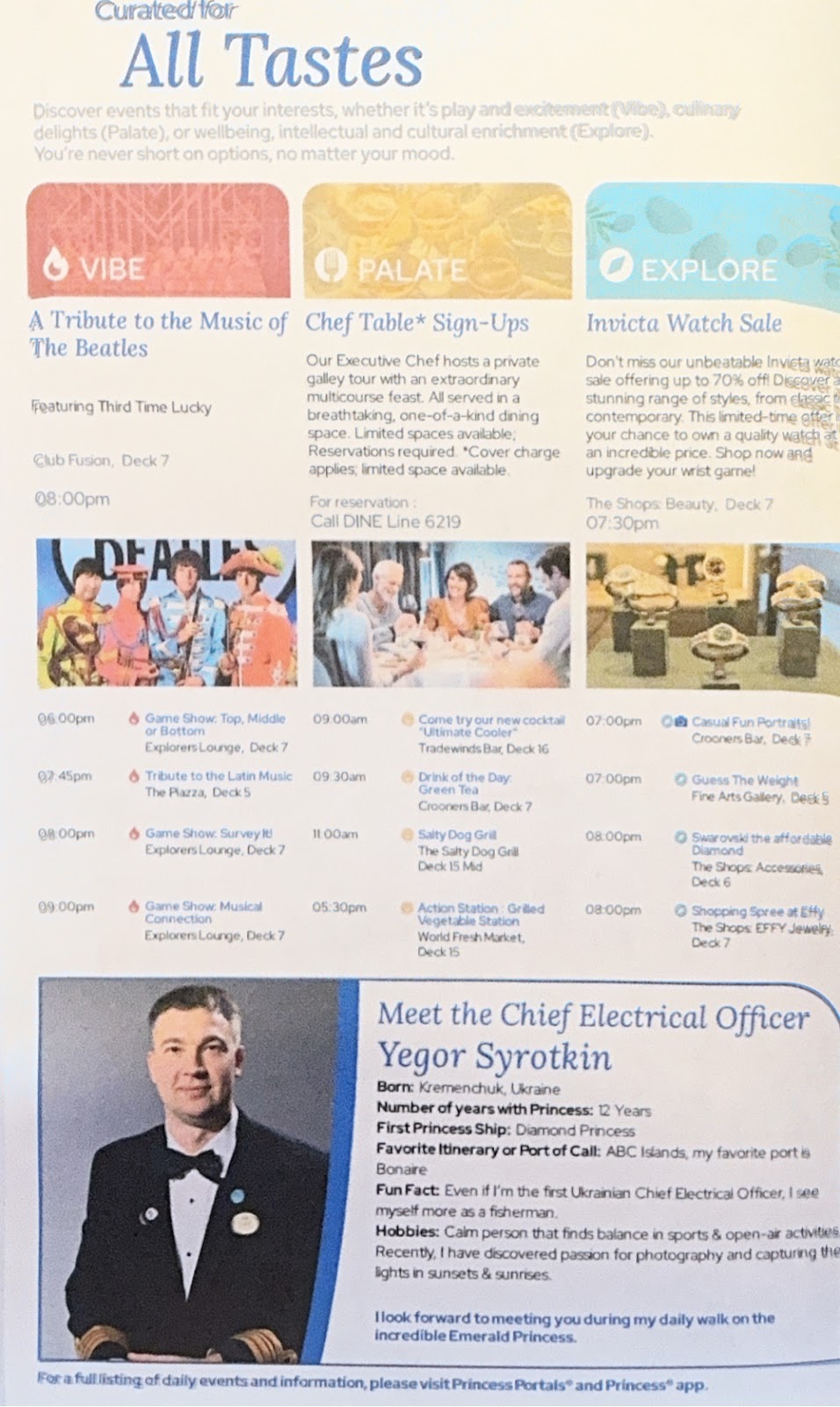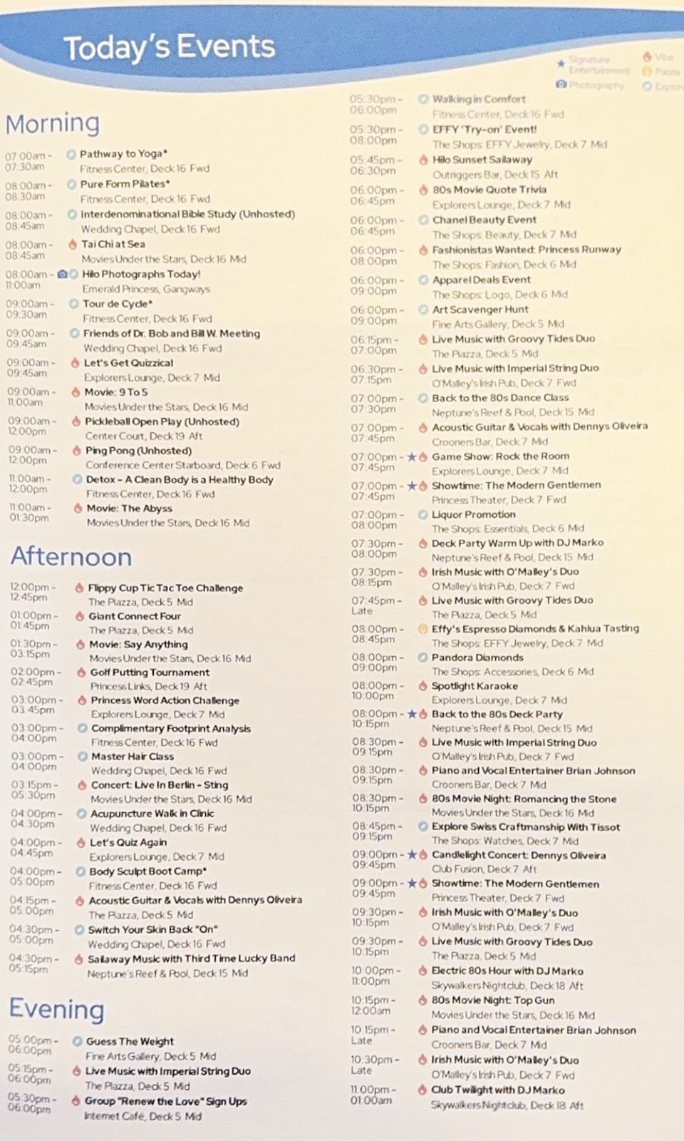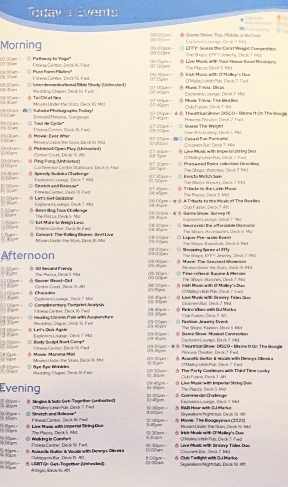 As soon as we missed our port today, I wondered about our Princess Theater entertainment for this evening. We were supposed to get a four person vocal ensemble on board today, and that obviously didn’t happen. Luckily, CD Nathan still had Erik Bryan, the Magic Maker in Magic to Do on board, and he performed his Let Me Be Frank show again tonight. I’ve probably seen this show enough already this season, but it is a good one, and was something to do tonight while we were waiting for the 70s Disco party in Club Fusion.
