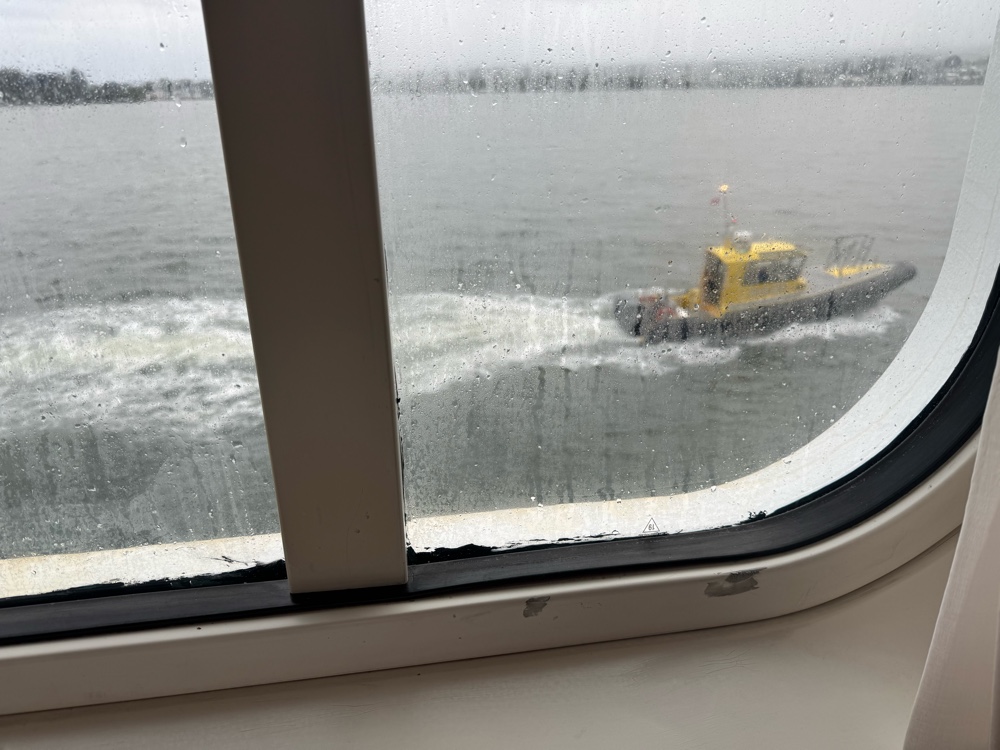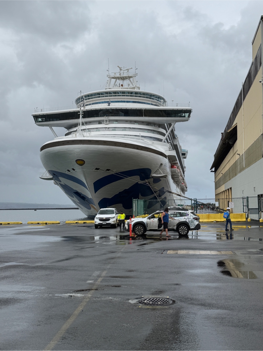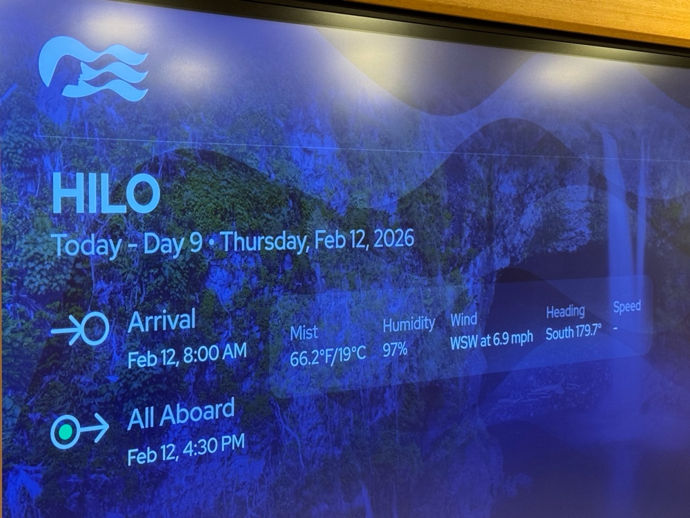 We were up early and knew immediately that it was too rough to get into the port of Nawiliwili. We had heard the pool sloshing all night long, and needed to hold on just to walk around our mid ship cabin. G left to get coffee and see what it looked like outside but I was still in the cabin at 7:35am when an announcement was made, “Man overboard, port side”. In all our days of cruising, I’ve never heard that one before, without including the word DRILL along with it. But just a few minutes later, Captain McBain announced that, after multiple attempts to board the harbor pilot, he had fallen into the water (an extremely dangerous situation; in fact, a harbor pilot was killed here in Kauai attempting to disembark the Island Princess almost exactly 20 years ago) but also that he had already been retrieved by the pilot boat and was uninjured. Huge relief.