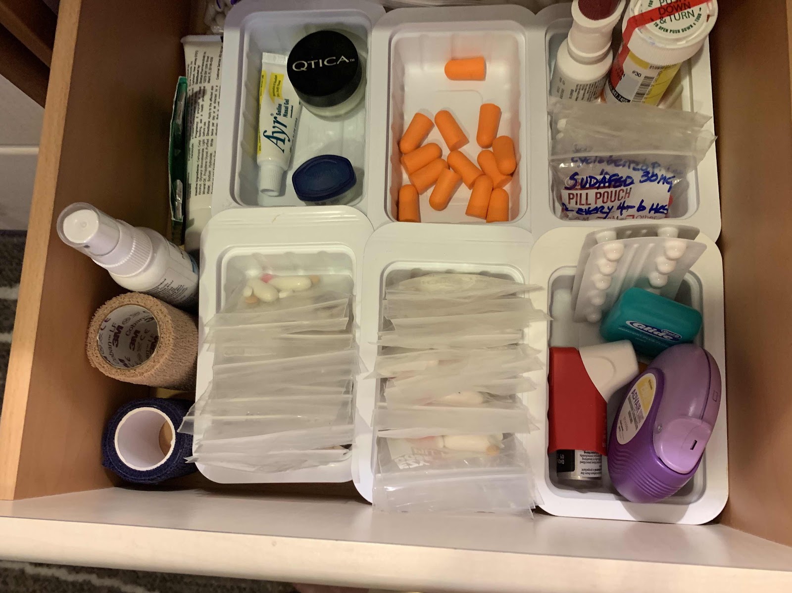 I use the containers my Restasis eye drops come in to organize medications, ear plugs and Coban