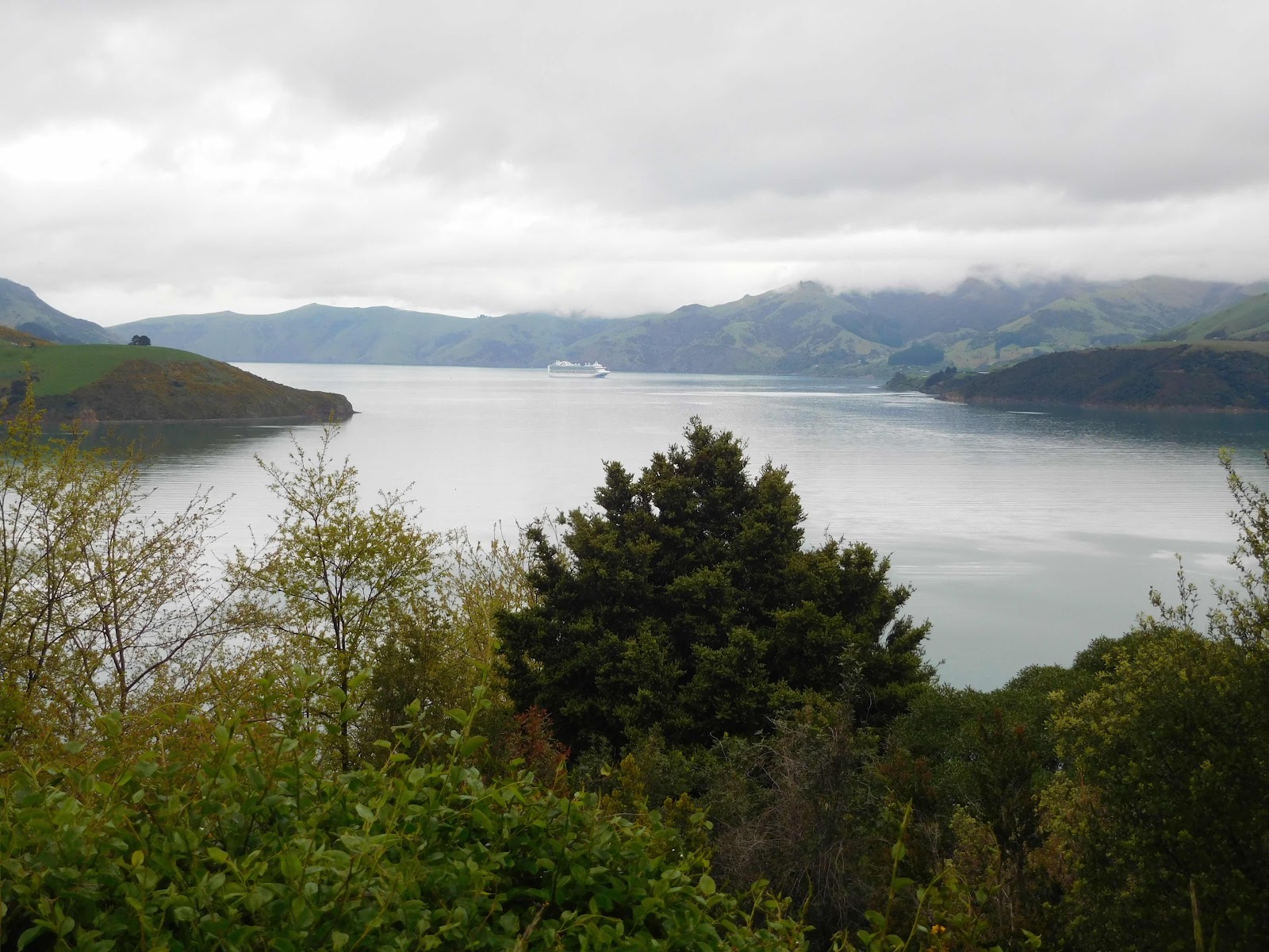 Our late departure from Tauranga two days ago was largely made up over our day at sea, but the Ruby Princess still made the turn to starboard to enter the Akaroa Harbour an hour behind schedule. Fortunately, the strong winds that had been predicted for today didn’t materialize, and though it was a little rocky boarding the tender this morning for the 20 minute transfer to shore, the ride itself was comfortable. It was hugely overcast but not yet raining when we first arrived ashore. Several months ago we, along with Paul and Marlene, had booked a two-hour nature tour with Pohatu Penguins, the ecotourism company we had used in the past for their four-hour tour. I wasn’t sure I’d be up for the hiking on the longer tour (it was a wise decision) but wanted Paul and Marlene to see that beautiful scenery we had enjoyed during that excursion. For photos of that trip, see my November 20, 2017 blog post.