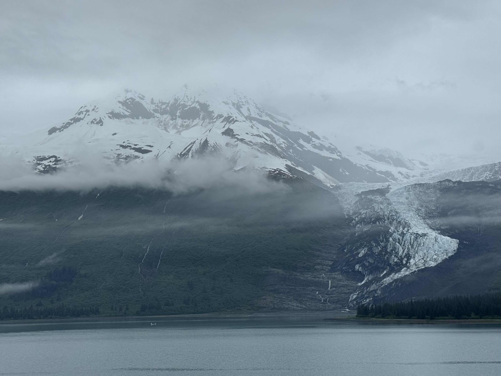 I wore everything I brought with me (including waterproof gloves) and camped on the Terrace Deck for hours in the cold drizzle while we cruised College Fiord. It was just so beautiful and moody with the clouds hanging low over the mountains. Somehow, there was still enough light to see some beautiful reflections on the water. I’ve seen College Fiord in all kinds of weather and from cruise ships and the much smaller 26-Glacier boat tour from Whittier and I’ve loved every experience.