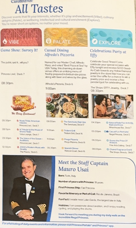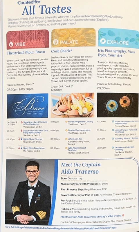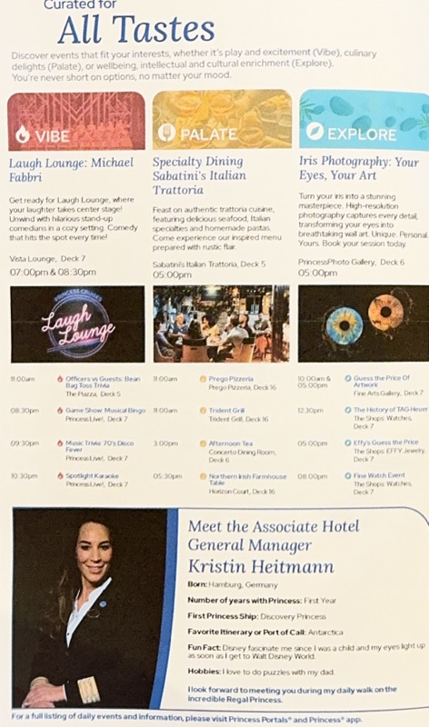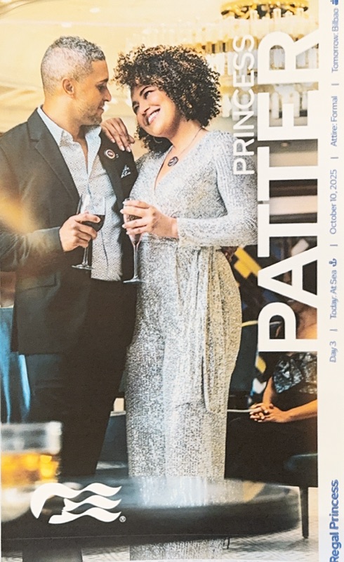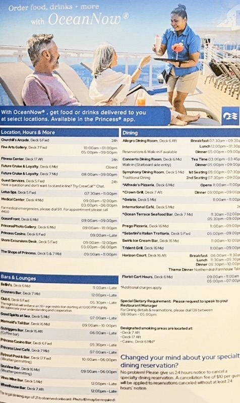 We went directly to the Princess Theater for tonight’s performance by Scottish vocalist Hannah Howie. For a change, we sat at the top of the theater off Deck 7 and apparently people have their favorite seats up there, too. By 7pm they were filled, but I was completely unaware, as we are generally front row people, how much musical chairs play takes place back there. Apparently lots of people consider these the “just in case” seats and leave the show starting five minutes in if it doesn’t appeal, and standees take their place. This goes on the entire show. Who knew?