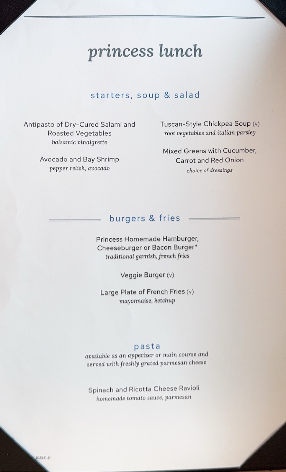 It started to sprinkle while we were in the shuttle going to the ship, but, at Berth 93, we had a covered area to wait under until we could get into the terminal. This won’t go down in anyone’s memory as a stellar embarkation, and, as we’ve seen in the past, we’ll never know the whole story behind the delays we encountered, We heard that 1) the ship was late arriving; 2) disembarkation didn’t start until 8:30am; 3) USPH was on board for inspections; 3) the CDC was on board for inspections and 4) they were waiting for a saxophonist to complete the band. 😉 I know the ship wasn’t late (I watched it arrive on the ship’s webcam) and I’m inclined to exonerate the saxophonist, so it was most likely one or both of the other reasons. Whatever, we were in the Botticelli Dining Room just after it opened at noon for lunch, armed with a healthy appetite. Half a cheese stick doesn’t have much staying power.