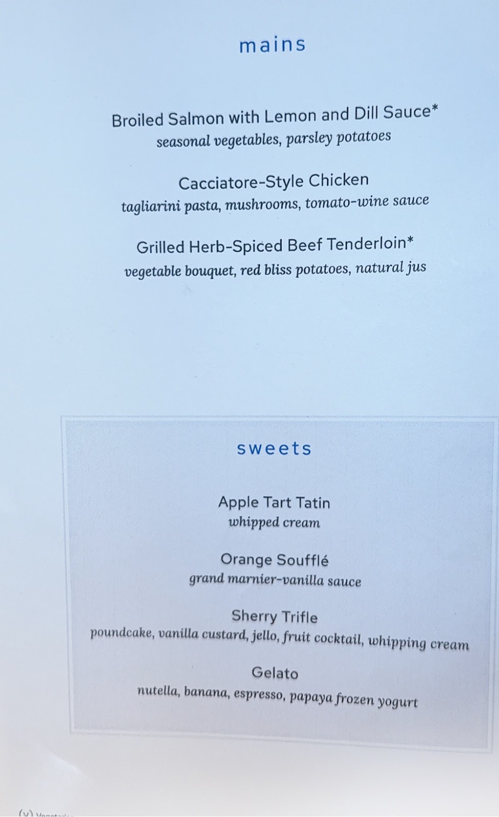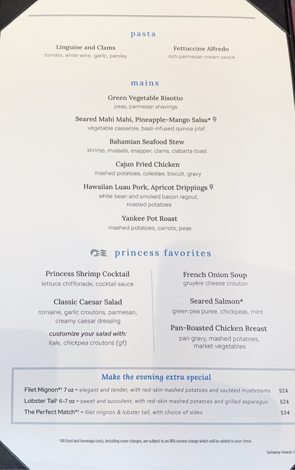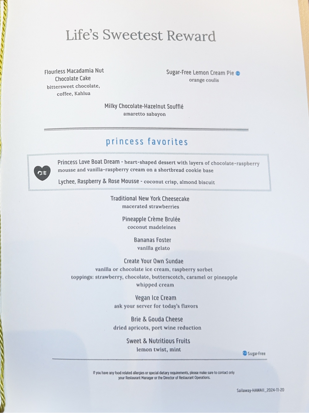 I ordered the macadamia nut flourless chocolate cake for dessert tonight. Flourless chocolate cake was once my favorite dessert but in recent years has been a disappointment. Well, this was, without a doubt, the best dessert I’ve ever had on Princess, and that includes MTG luncheon desserts. And hopefully it will be on the menu next cruise also!