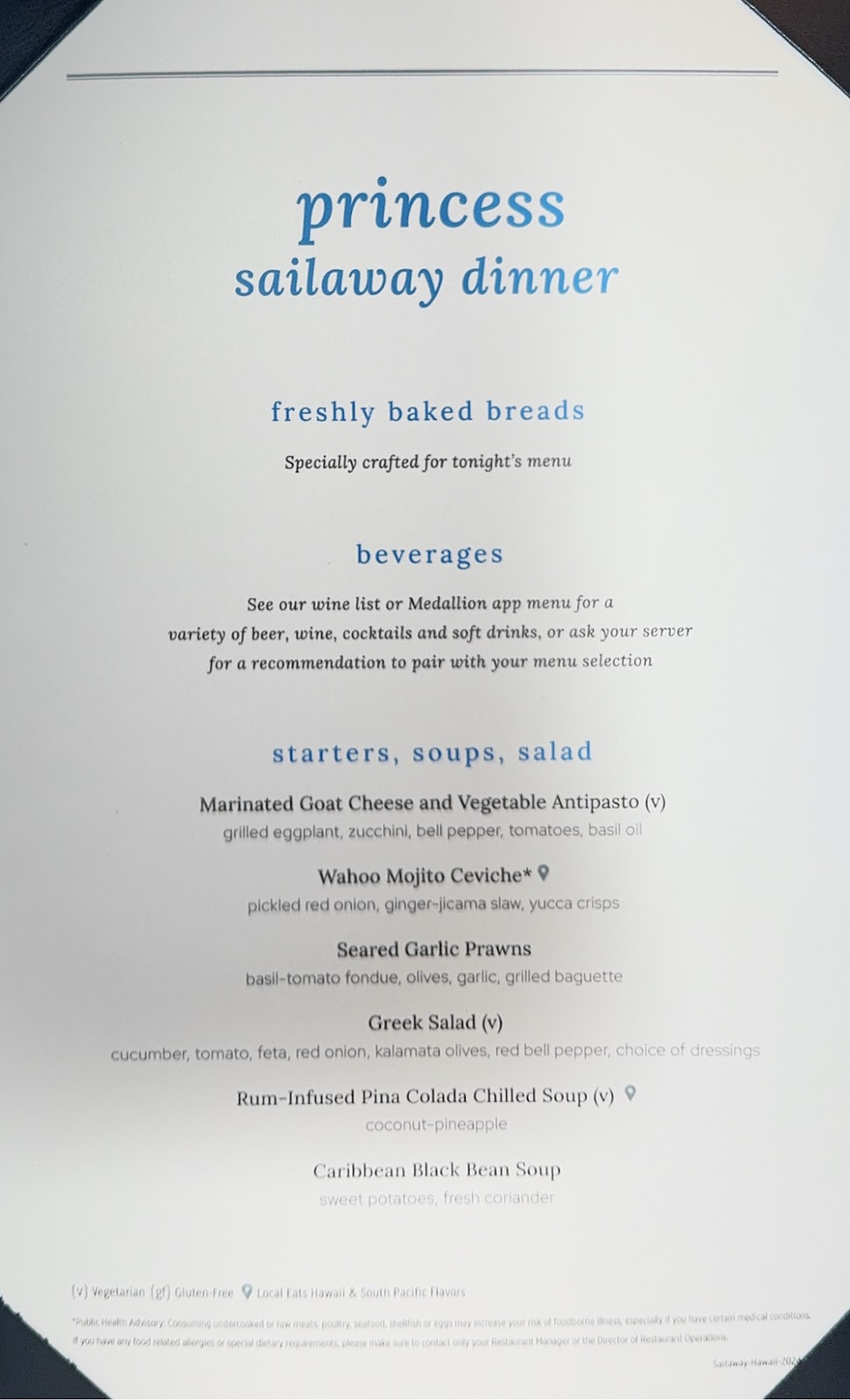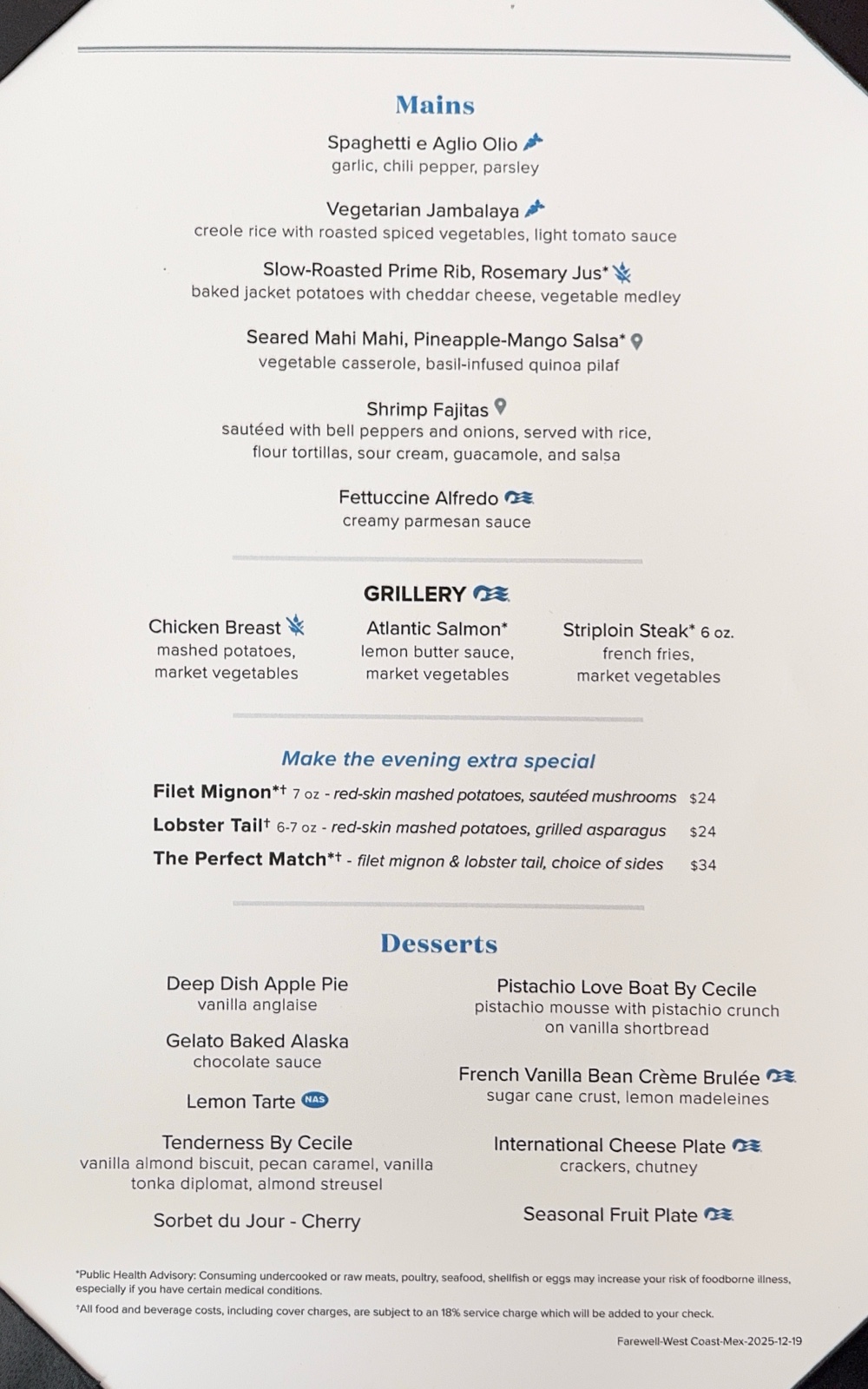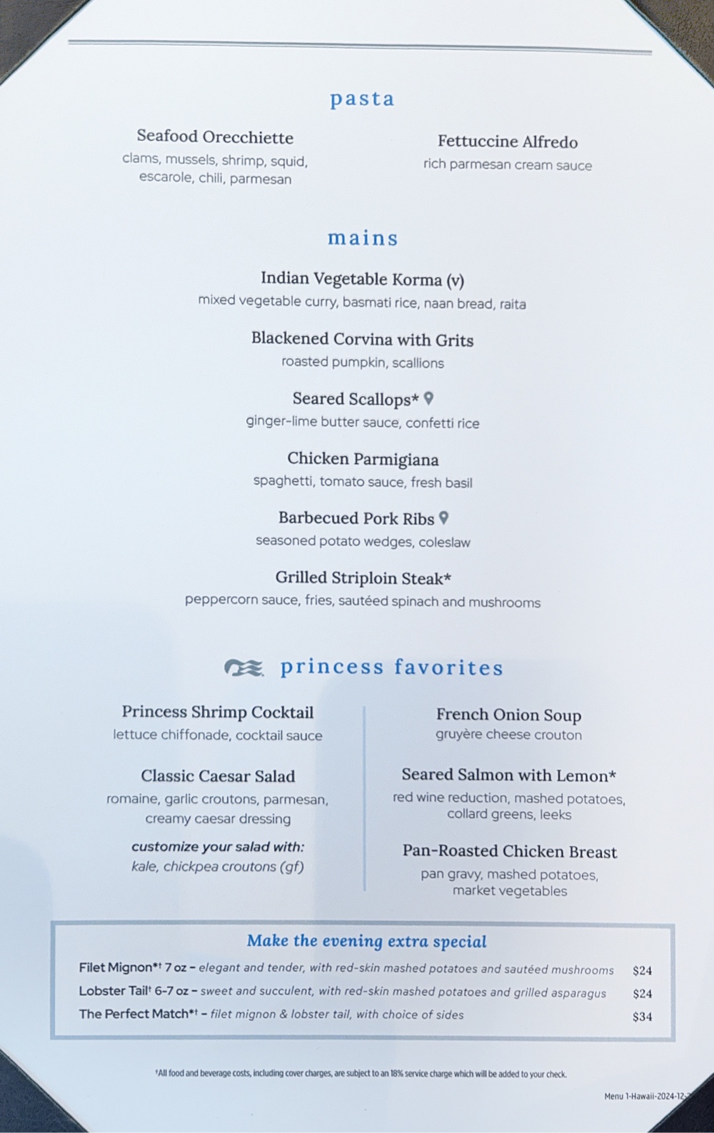 I ordered the macadamia nut flourless chocolate cake for dessert tonight. Flourless chocolate cake was once my favorite dessert but in recent years has been a disappointment. Well, this was, without a doubt, the best dessert I’ve ever had on Princess, and that includes MTG luncheon desserts. And hopefully it will be on the menu next cruise also!