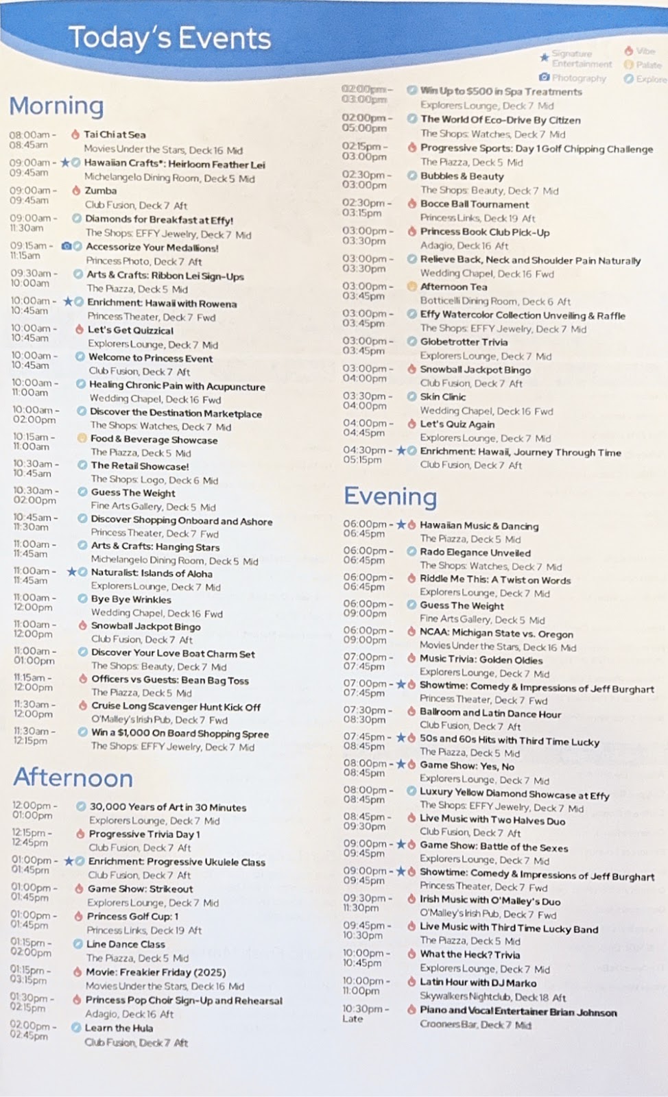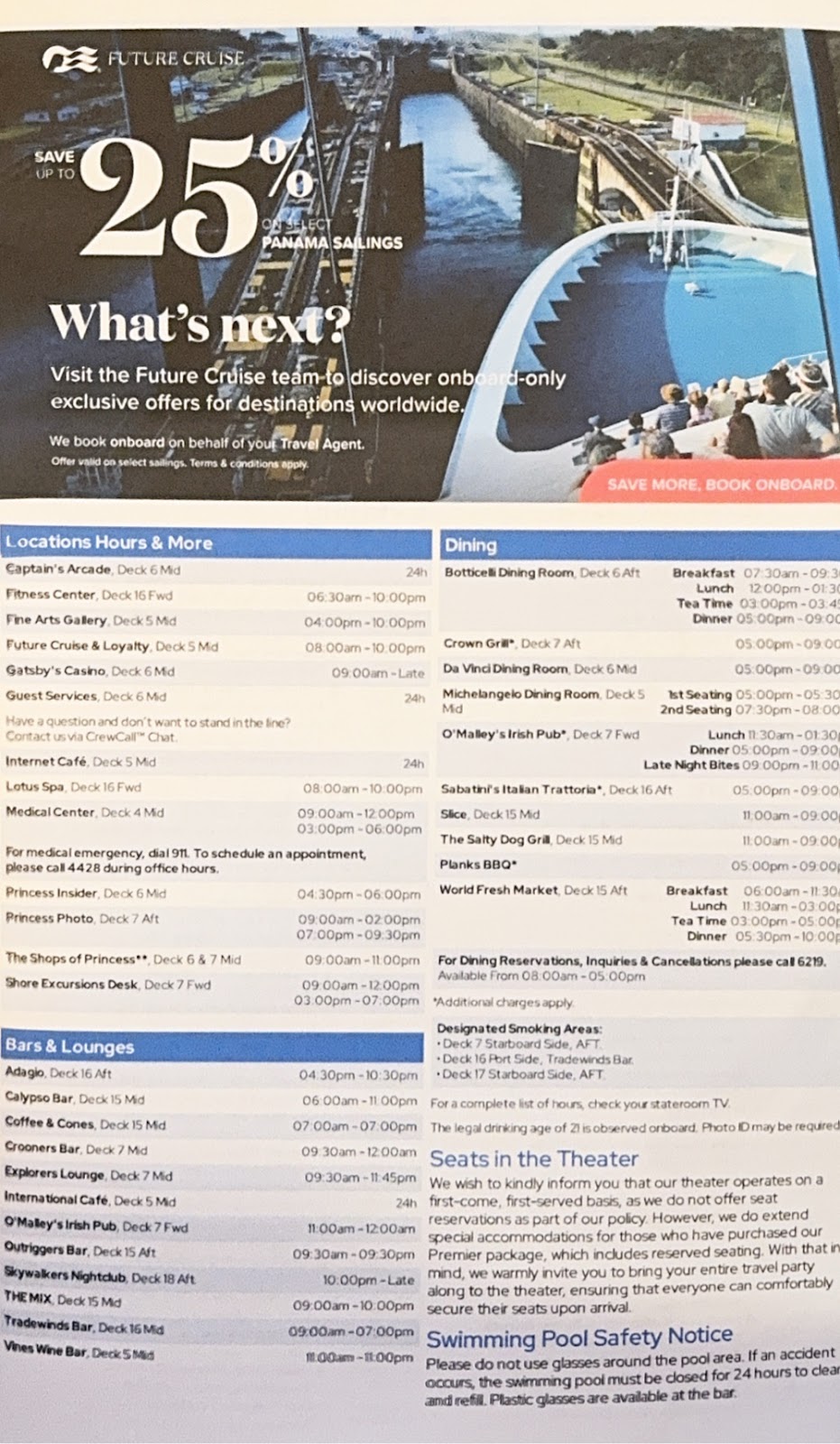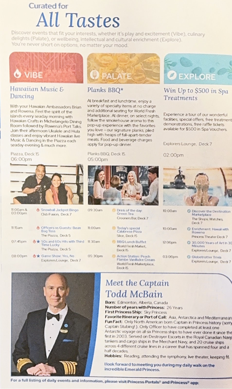 I noticed while we were in the Princess Theater awaiting tonight’s show with comedian/impressionist Jeff Burghart that I had missed another enrichment lecture on the history of Polynesia at 4pm.  I should be able to catch it later this evening on our cabin TV. There simply aren’t enough hours in the day!