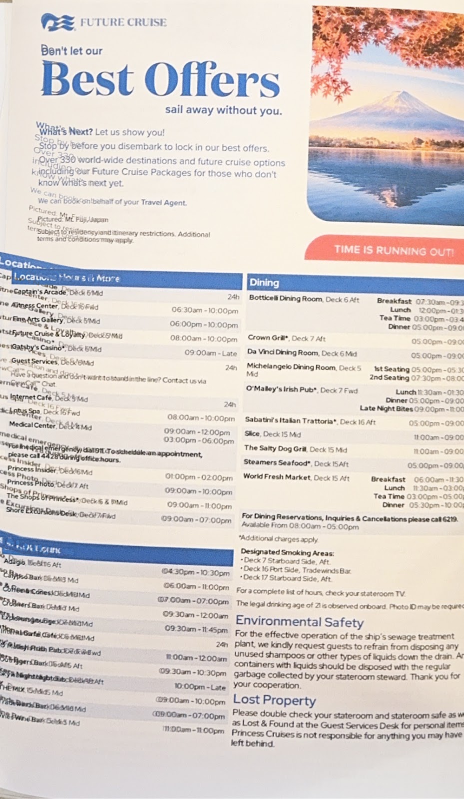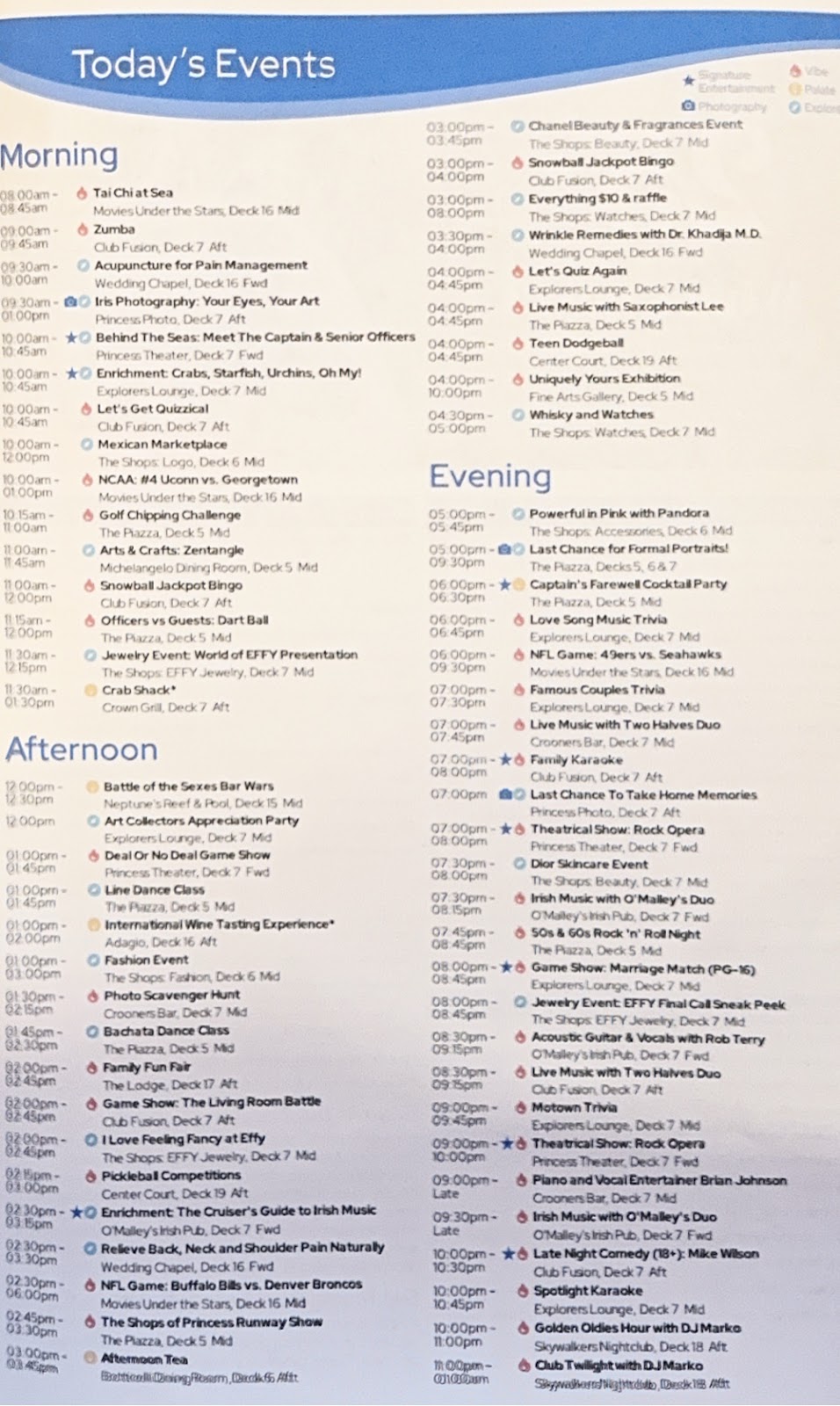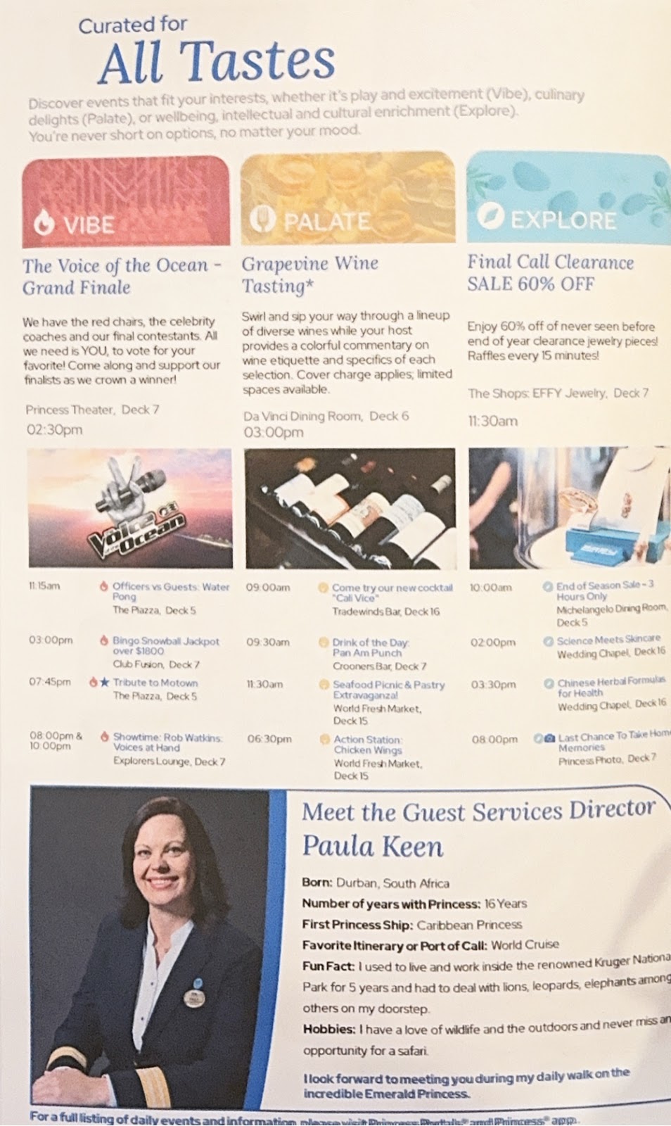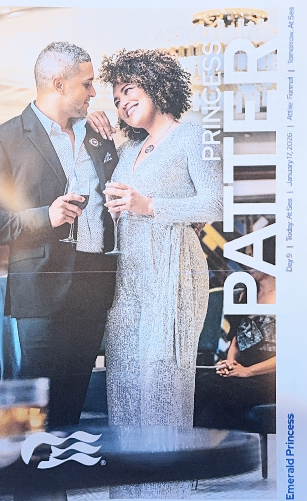I noticed while we were in the Princess Theater awaiting tonight’s show with comedian/impressionist Jeff Burghart that I had missed another enrichment lecture on the history of Polynesia at 4pm.  I should be able to catch it later this evening on our cabin TV. There simply aren’t enough hours in the day!
