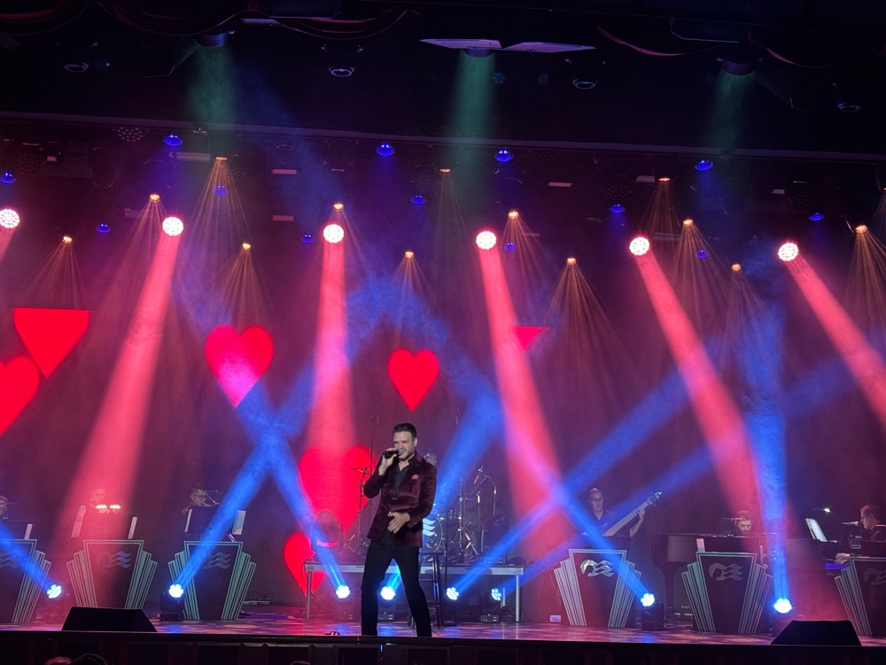 Today’s Princess Theater show was called Mic Drop Moments with vocalist Connor Bogart, who was the rock tenor in last night’s protection show Rock Opera. We missed that last night but I would hugely wager that we’ll be seeing it again in the early days of next cruise before Connor leaves the ship. His own show tonight was fabulous, so entertaining. He is such a wonderfully talented (and nice) guy.