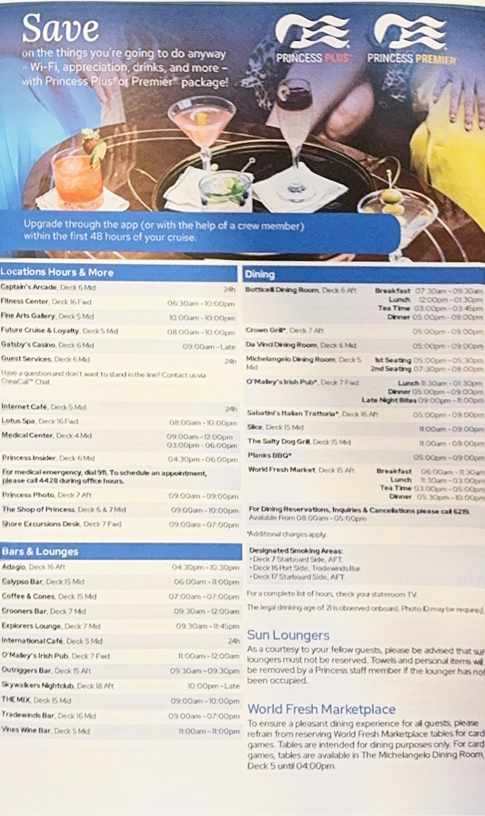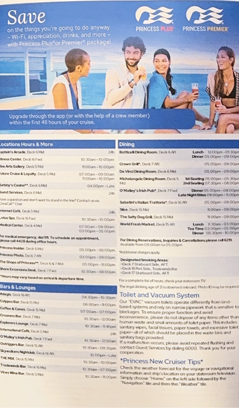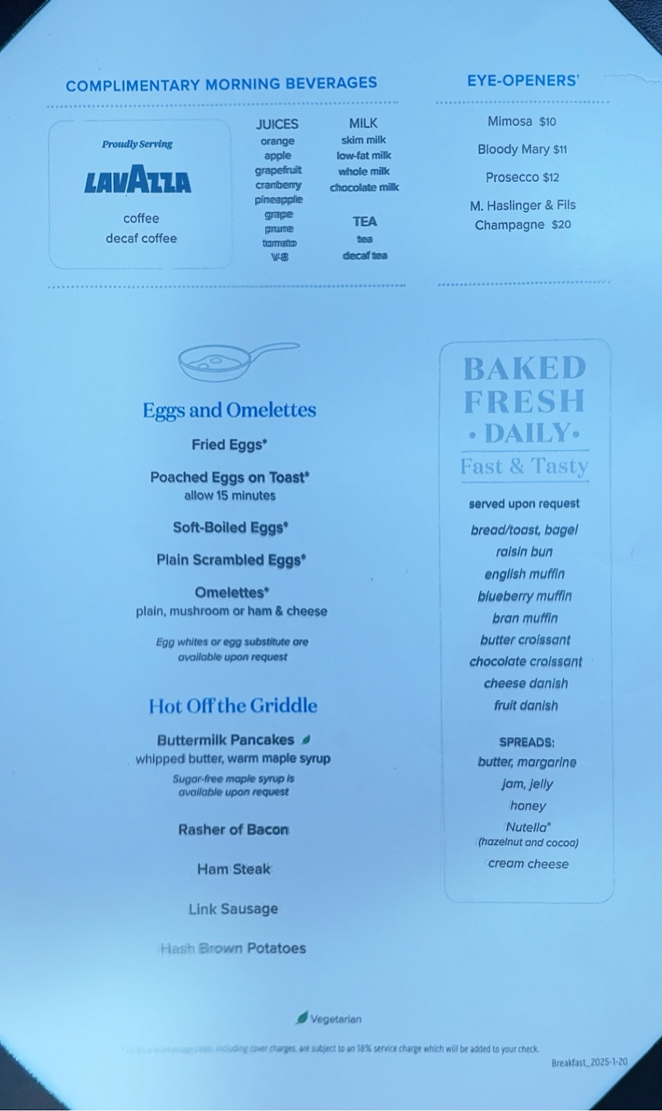 The Medallion app system went down this afternoon (I had noticed the WiFi wasn’t working) and it really wreaked havoc with Michelangelo Dining Room traditional dining table reservations. Really wreaked havoc. We weren’t personally affected since we already had our table, and the system was eventually reset which straightened everything out, but it was a rough start to the cruise.