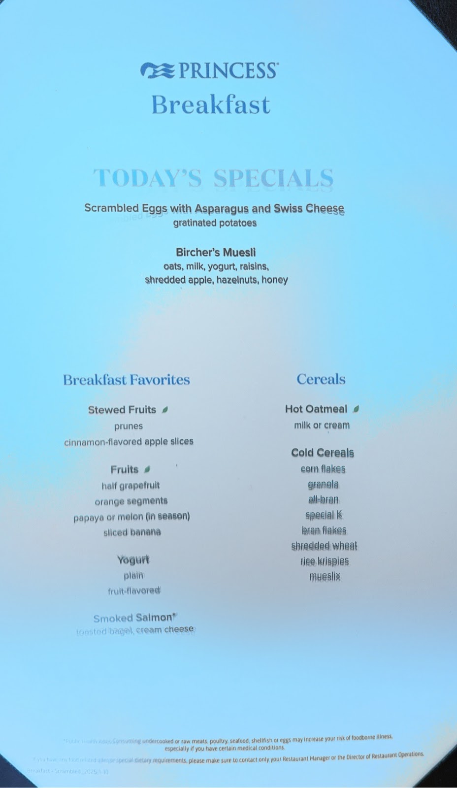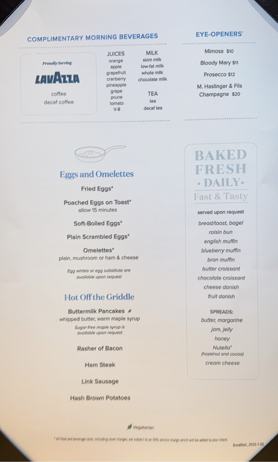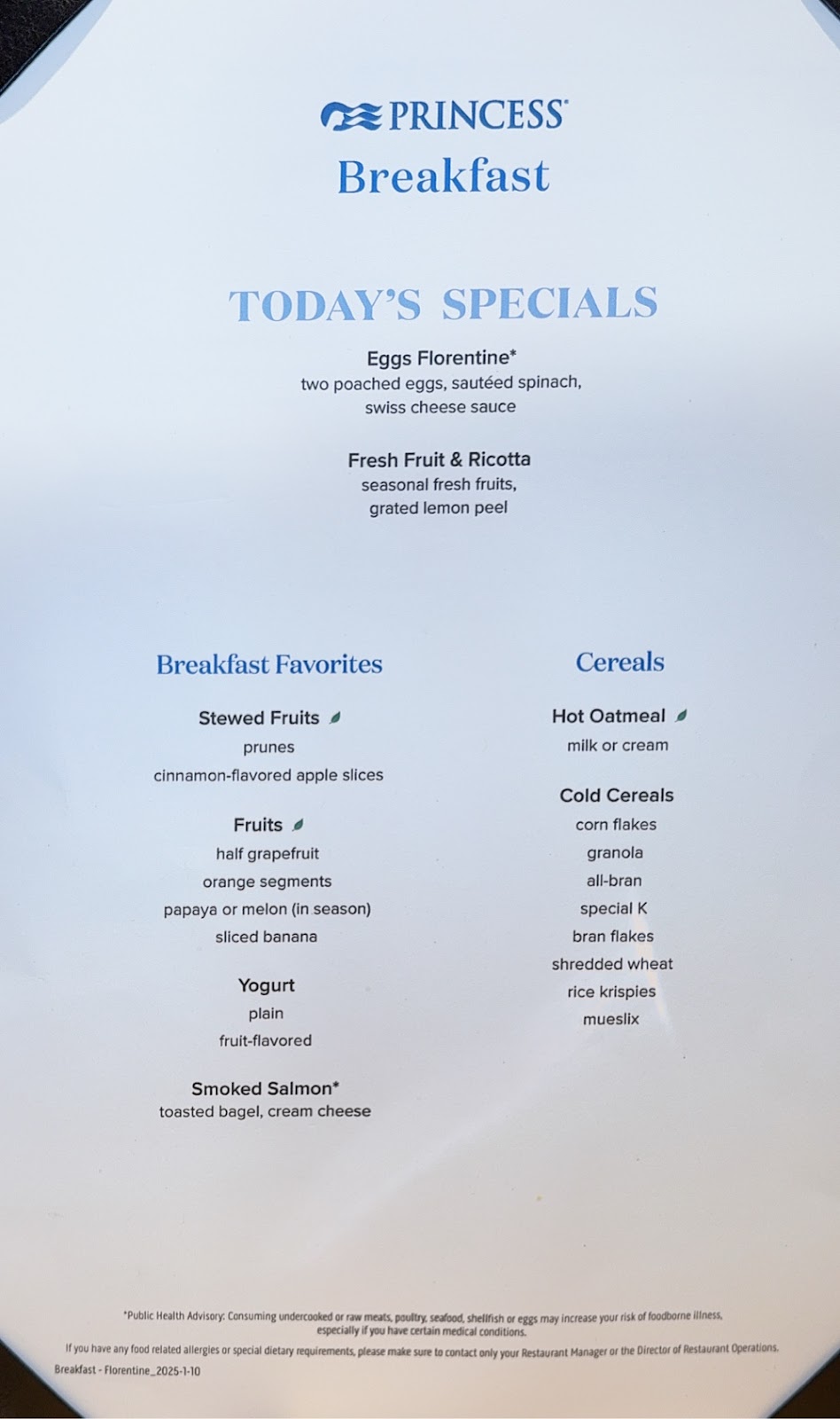 The alarm was set, as it usually is on turnaround days, for 6am, and we were in the Michelangelo Dining Room when it opened for breakfast at 6:30am (already a long line of people waiting to get in). In some very bad luck, a lady at the table just feet away from ours was at that very messy stage of a cold, which is often the case on turnaround days. Even people who thoughtfully stay in their cabin when sick have to be out and about on turnaround days.