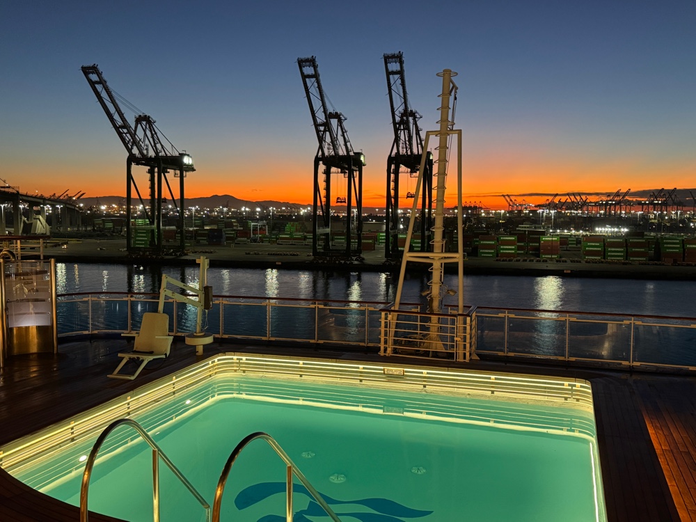 We move clocks back another hour overnight which is always a happy thing, but is especially appreciated tonight as I make up for last night’s sleep drought. We’ll have a couple more time changes at the beginning of the next cruise as we have five sea days sailing to Hawaii. BTW, we may have had fog today, but the seas were very calm on this return to LA, unlike last cruise where we had a fair bit of bounce. Fingers crossed things stay smooth all the way to Hawaii.