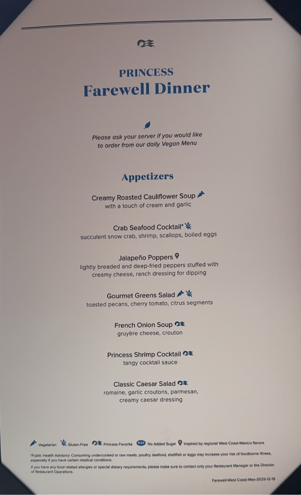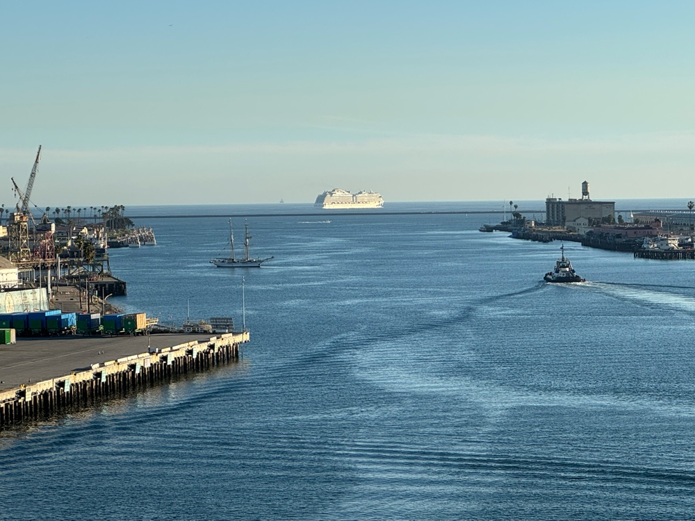 Our new cabin is an inside on Lido Deck forward, which feels totally different from being on Riviera Deck aft. We haven’t been in a Lido Deck cabin since right after the start up on the Majestic Princess in August 2021. We were on the deck over the bridge, which is just steps from our cabin , for sail away which was delayed nearly an hour. We stayed out there until we passed the breakwater and then went to the Elite Lounge which is held in Skywalkers this cruise. More memories; we’ve done lots of Elite Lounges in Skywalkers on the Emerald Princess over the years. There must have been 25 dolphins frolicking behind the ship today as we sailed into the ocean with the expansive views of Long Beach and the SoCal coastline in the distance.