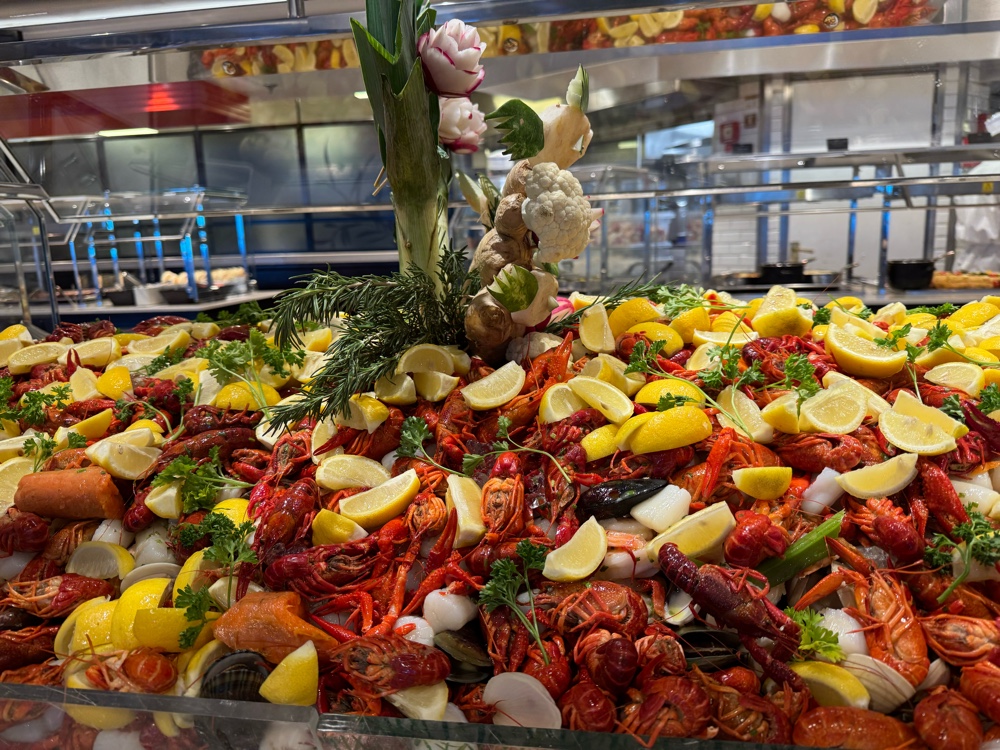 I was first in line at the World Fresh Marketplace when the seafood extravaganza opened at 11:30am, not because I was so anxious to be the first to load my plate with shrimp and scallops but because I wanted blog-worthy pics for this post. And then I loaded my plate with twelve shrimp and six scallops. Pure joy. 😉