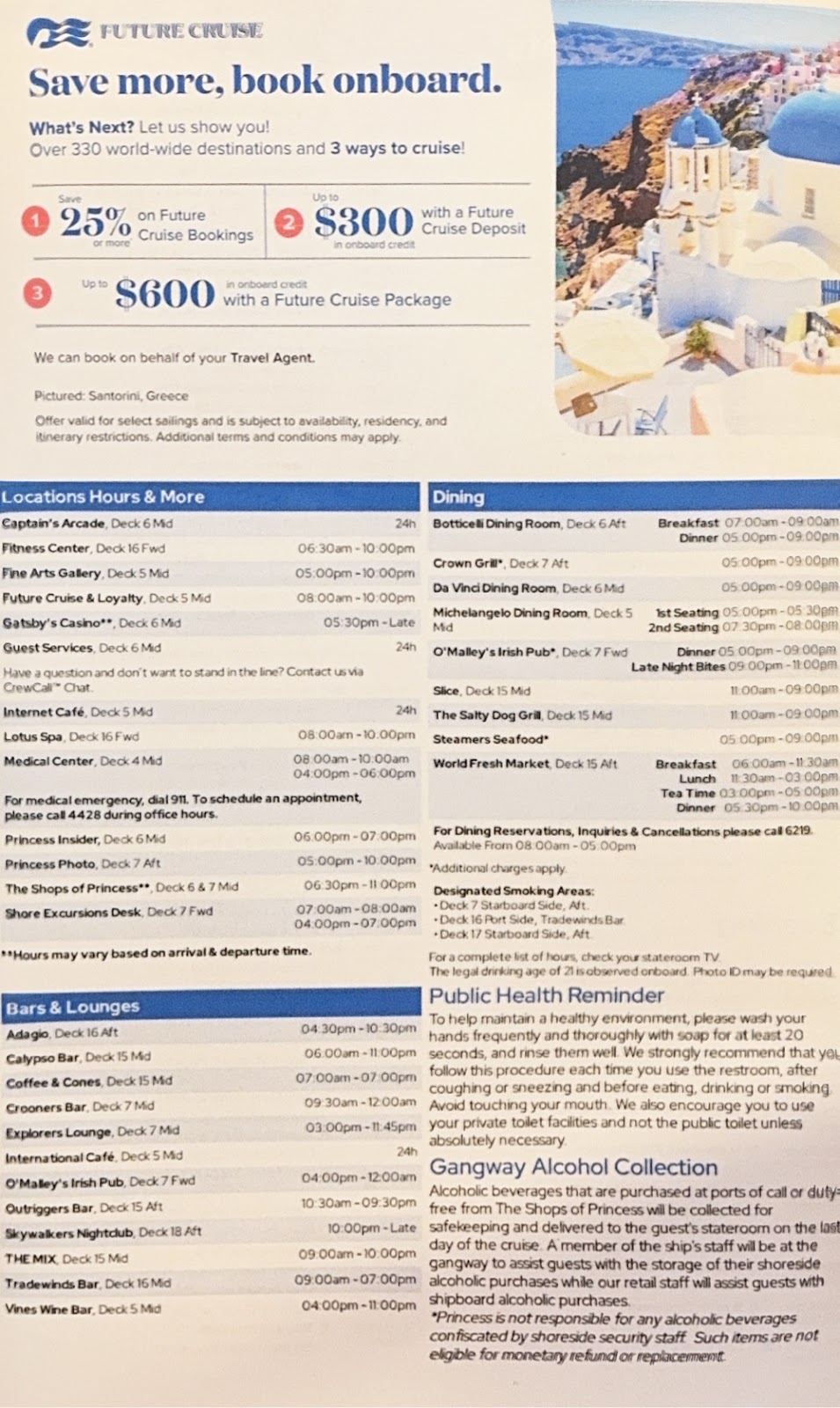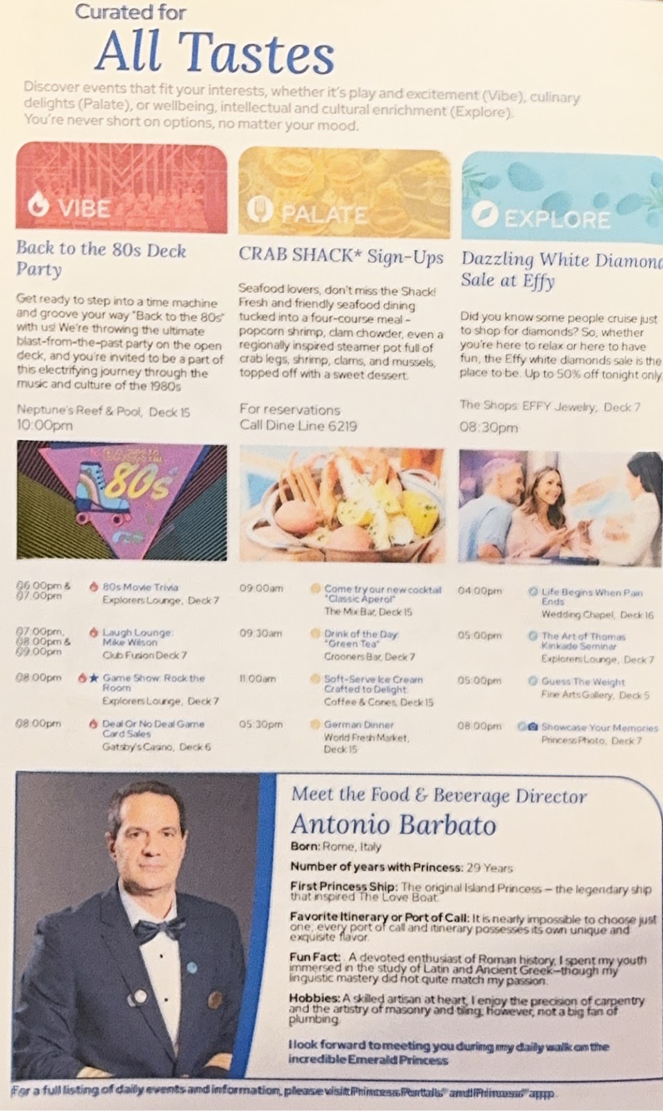 The evening followed the usual routine: Elite Lounge fare enjoyed on the Promenade Deck, dinner in the Michelangelo Dining Room and the 7pm Princess Theater show. Radio Recall with vocalists Jenna and Aaron was very entertaining and provided a great variety of music, but Aaron’s Gethsamene from his role as Jesus in the 50th anniversary remake of Jesus Christ Superstar would make a believer out of anyone. I got chills.
