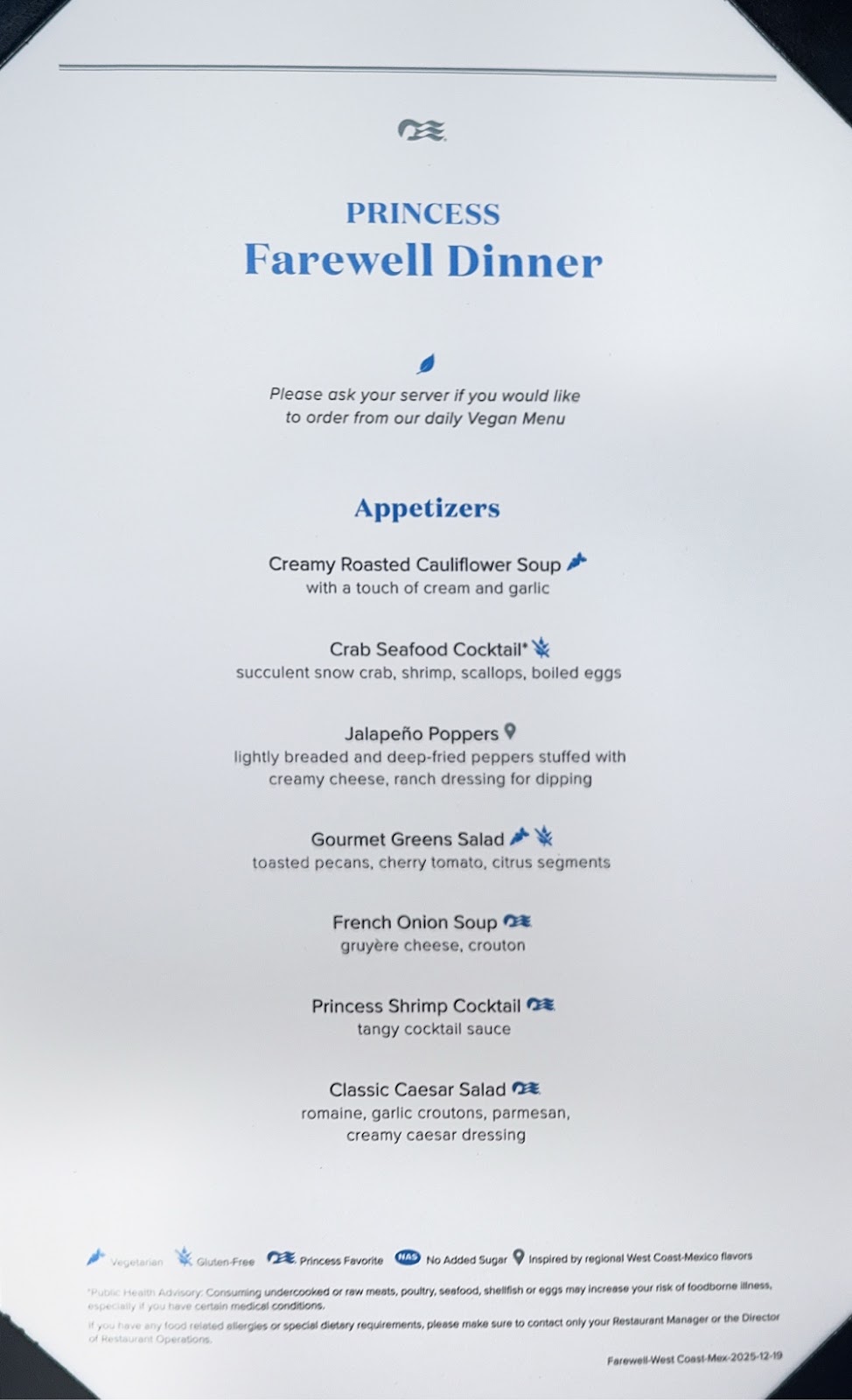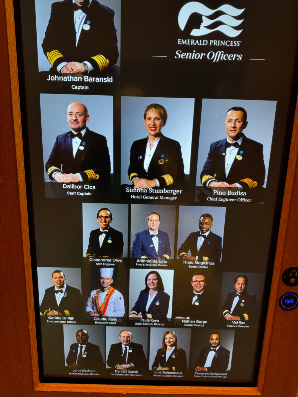 We dressed casually (and warmly) for this evening, going first to the Elite Lounge, then to our final dinner with Baran. His junior waiter, who we’ve only seen a couple of times due to illness was finally back tonight. We actually commented to each other today that we haven’t heard any deep coughs or sneezes on this cruise, and we start over with new passengers tomorrow which bodes well for continued good health for us (and, for the record, that marks 73 days of cruising without contracting the cruise crud for me!).