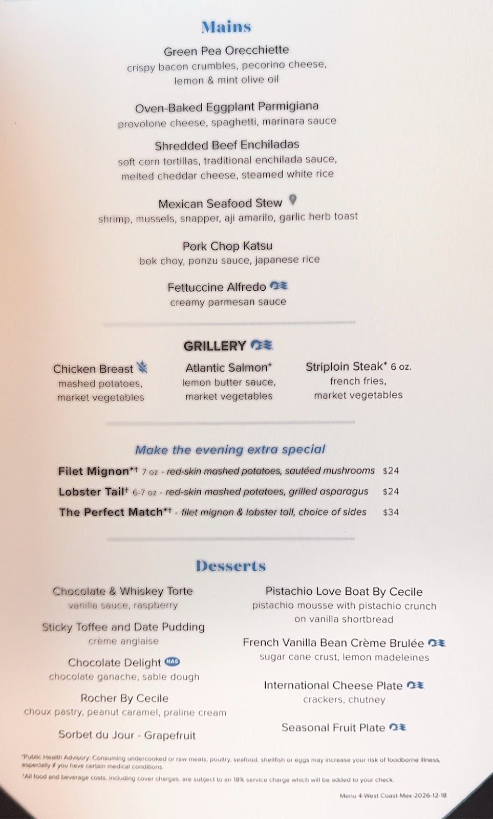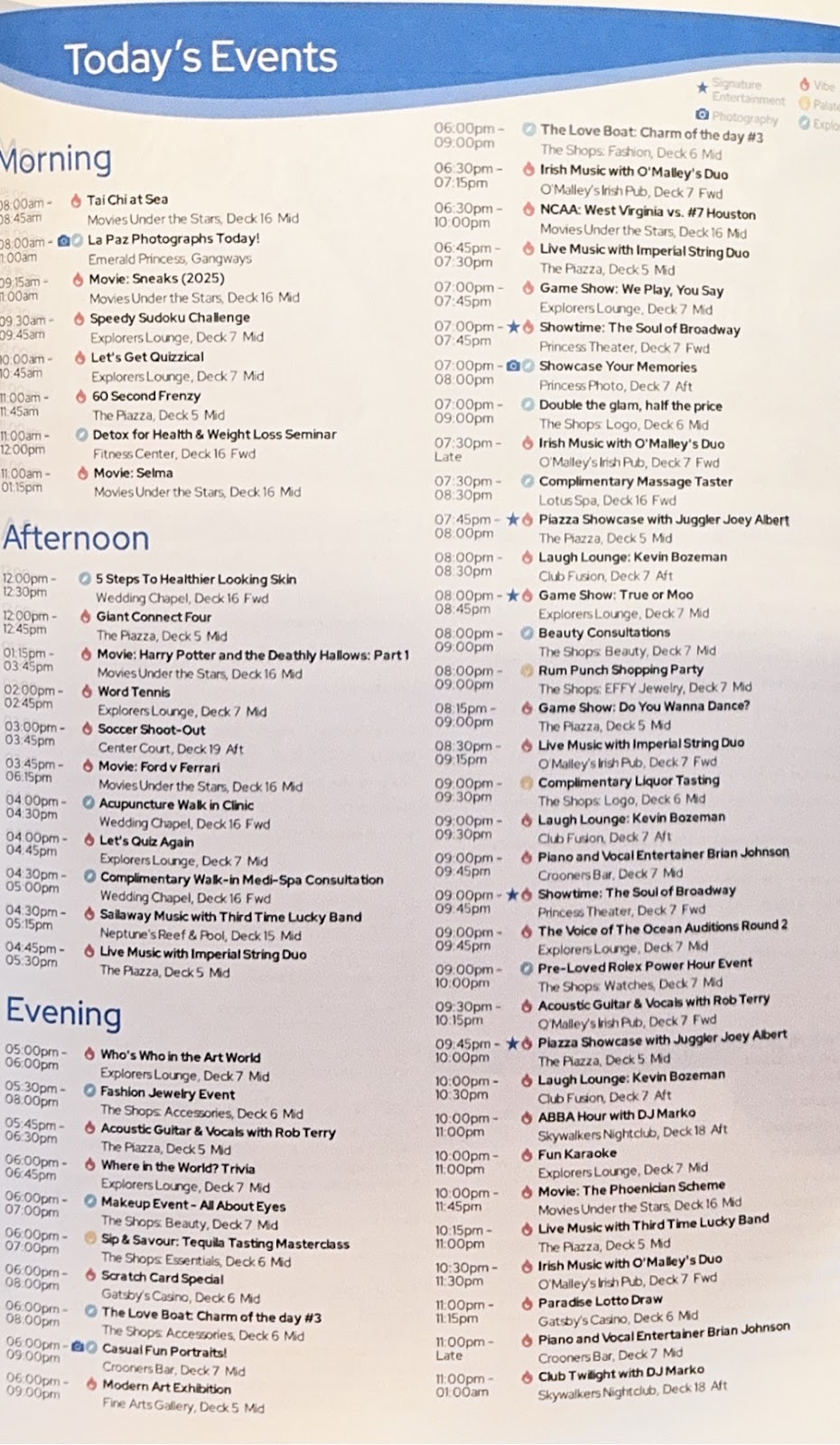 We first went to breakfast in the Botticelli Dining Room. I’m a bit disconcerted to find one after another of our waiters being out ill, and I’m hearing more and more hard sneezes this cruise than last, but, so far (knocking on wood and anything remotely wood-like here) I am staying well.
