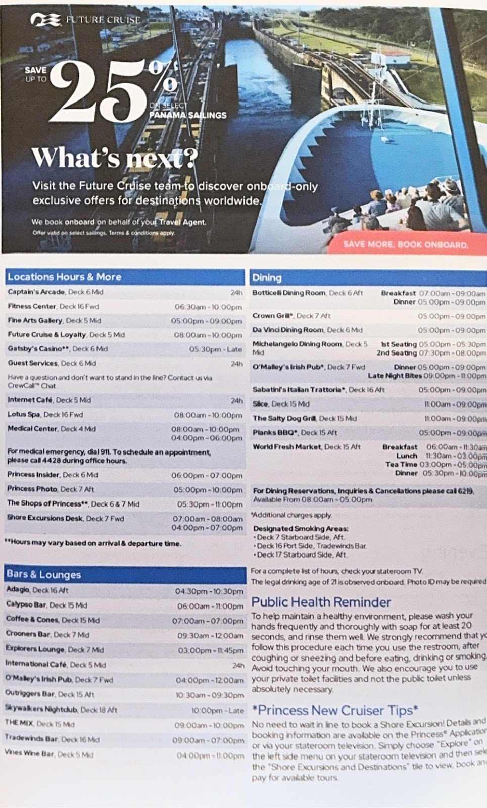 We are lightly and quickly, wanting to be on the Promenade Deck for sunset. However, the entire port side was closed off for maintenance. Darn! I took these pics through the door glass, so if they look especially fuzzy, that might explain it.