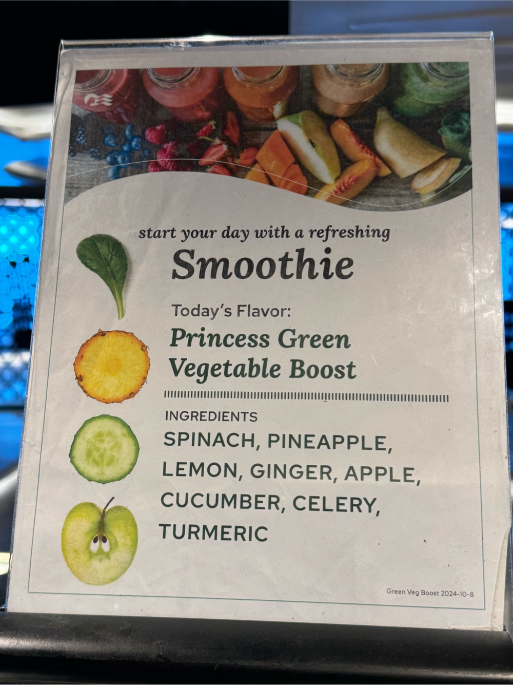 I continue to be impressed with the Emerald Princess’s World Fresh Marketplace. There seems to be so many options in a smaller, more easily accessible space than on the Royal Class ships. There, I’m constantly walking up to the Bistro to find one item, then to the Pastry Shop, then to the back area. Much easier here. And healthy choices too: chia seed sludge to add to yogurt or cereal or muesli or oatmeal, veggie smoothies and fruit smoothies.