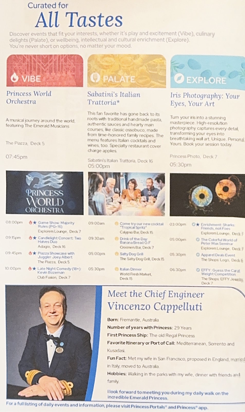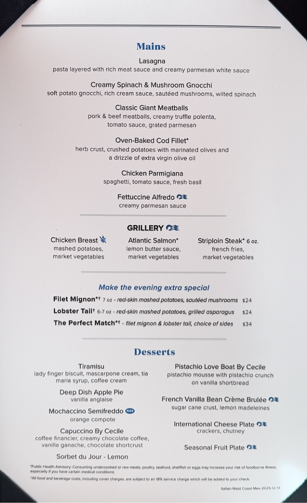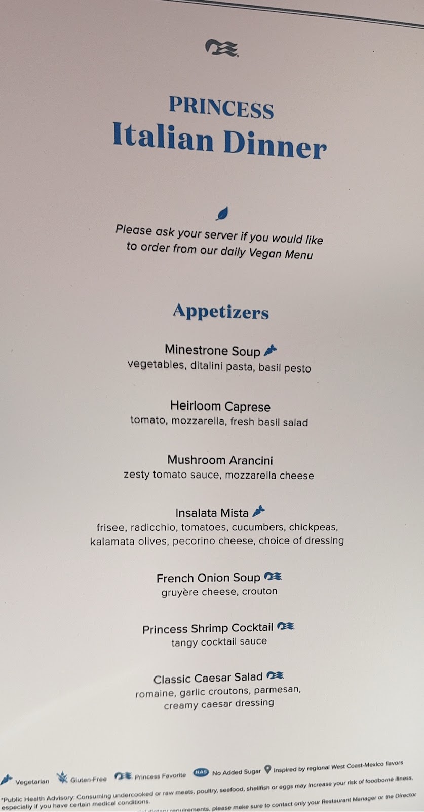 With tonight’s Princess Theater entertainment being a ventriloquist, we instead went to the Explorers Lounge for the first time for a GPS Sing Along trivia. We imagined it would be songs with locations in the lyrics or titles, but it wasn’t that at all. It was a GPS-type voice reading lyrics and we had to guess the song and then sing it, karaoke style. Not our thing (at all) but some people seemed to enjoy it. That’s okay…we move clocks ahead an hour tonight and decided to make it an early evening.