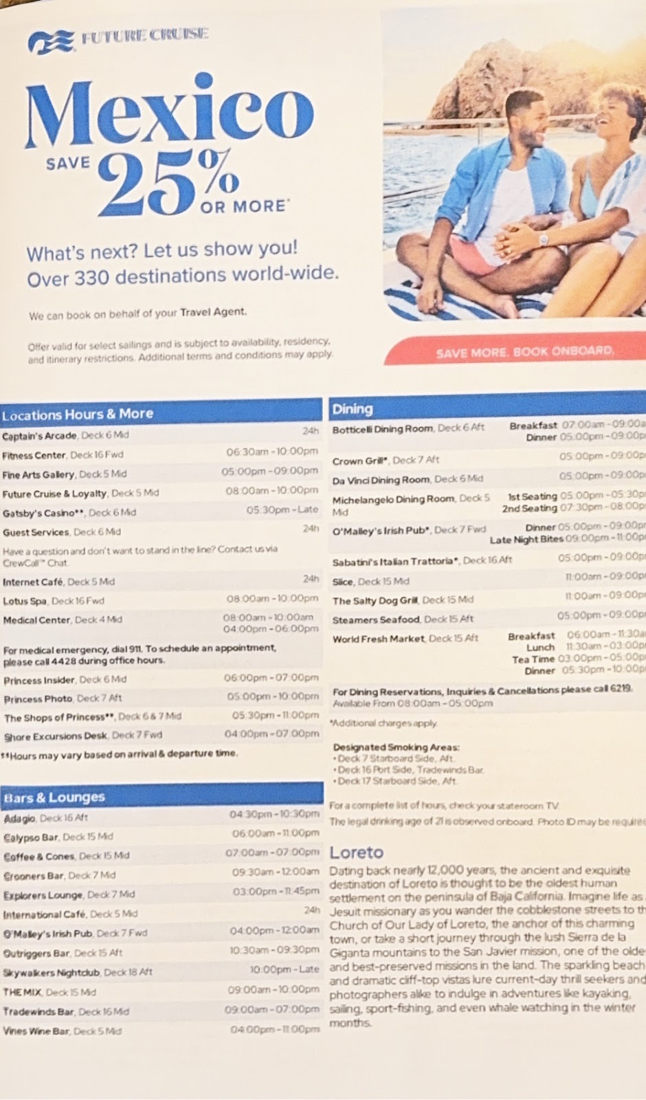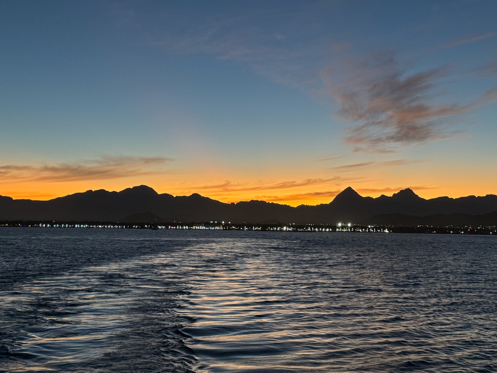 Finally, there was no line at all and we took a tender back to the Emerald Princess about 4pm, changed for the evening and went to both the Elite Lounge and dinner not a bit hungry. We each had one course and were on the Promenade Deck for sunset as we sailed from Loreto.