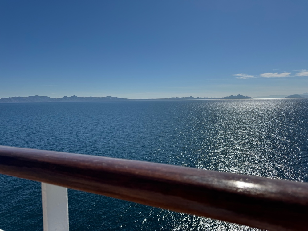 I was a little slow to get moving this morning and didn’t join G at breakfast in the Botticelli Dining Room. Instead, I eventually got coffee and sat on the very back of the Terrace Deck with my AirPods screwed into my ears listening to mellow piano music and watching the sun glisten like diamonds on the water with the majestic mountains in the background and generally grooving on life when a fellow passenger, with every other table empty, chose to join me and start commenting on how I looked nice and my smile and…first, no thank you, second, can’t you see this big ole wedding ring on my left hand and third, you just screwed up my peaceful reverie here. I finished my coffee and moved on…quickly.