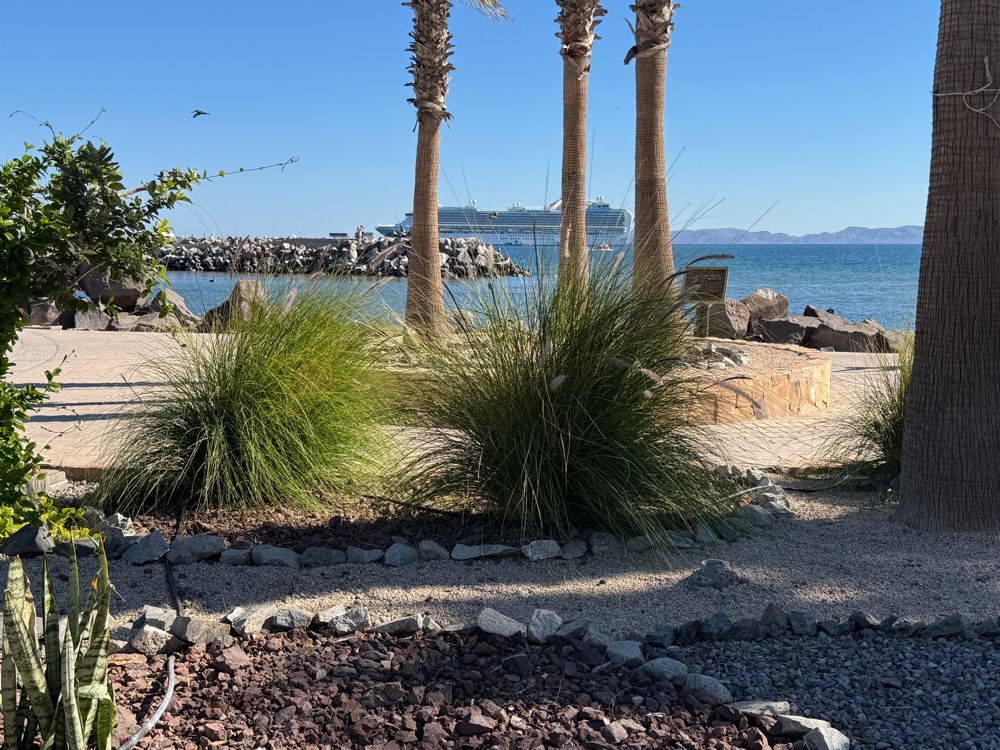 As soon as open tender was called, G and I went ashore just for our daily walk and after a couple of hours ended up at the bar on the pier where we started with margaritas and eventually added chips and salsa and then lunch and maybe more margaritas while waiting for the line for the tender back to the ship to die down. We were kept highly entertained by the hundreds of pelicans and laughed about how they would never win a medal in competitive diving because they didn’t enter the water with any kind of grace at all, making a huge splash every time they dive bombed for fish. And then we wondered about what percentage of time they actually caught a fish because they seemed to do it over and over and over and should have been stuffed to the gills.