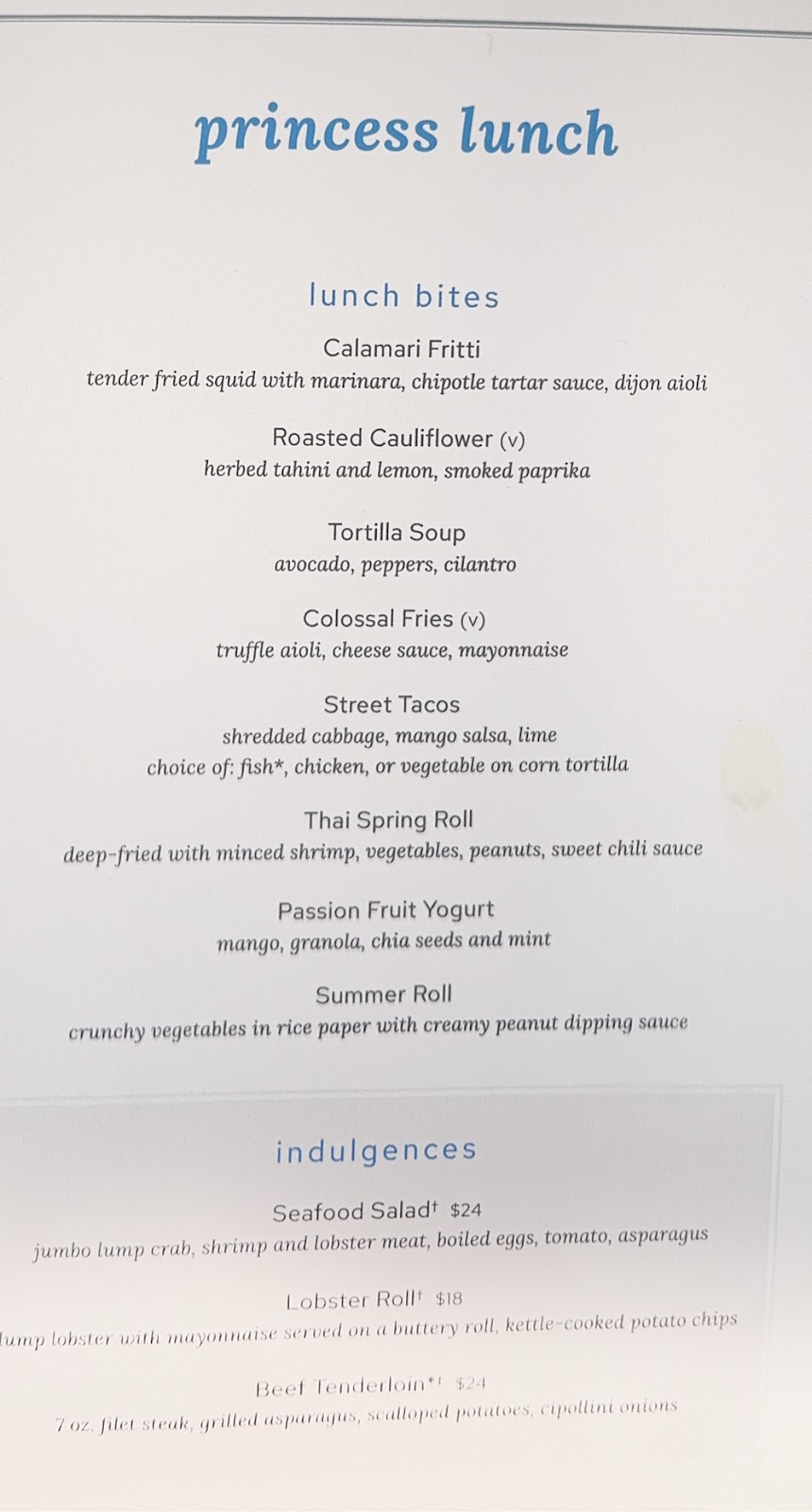 The evening started with the Elite Lounge in Skywalkers and then dinner with Ronie and Ivy in the Michelangelo Dining Room. We had to rush- we always have to rush dinner- because the Princess Theater shows start at 7pm and one of us (not me) is mighty fussy about where we sit, so we generally get to the theater 45-60 minutes early. It works well for blog writing, not so good enjoying for dessert and coffee after our dinner. We literally eat and run.