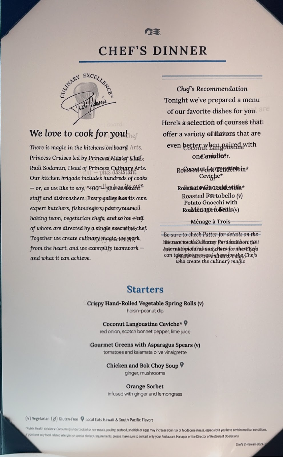 There was a second vocal show at 9pm in the Explorers Lounge, but today’s hours in the sun and tomorrow’s planned late evening in Honolulu had us back in the cabin by 8:30pm.