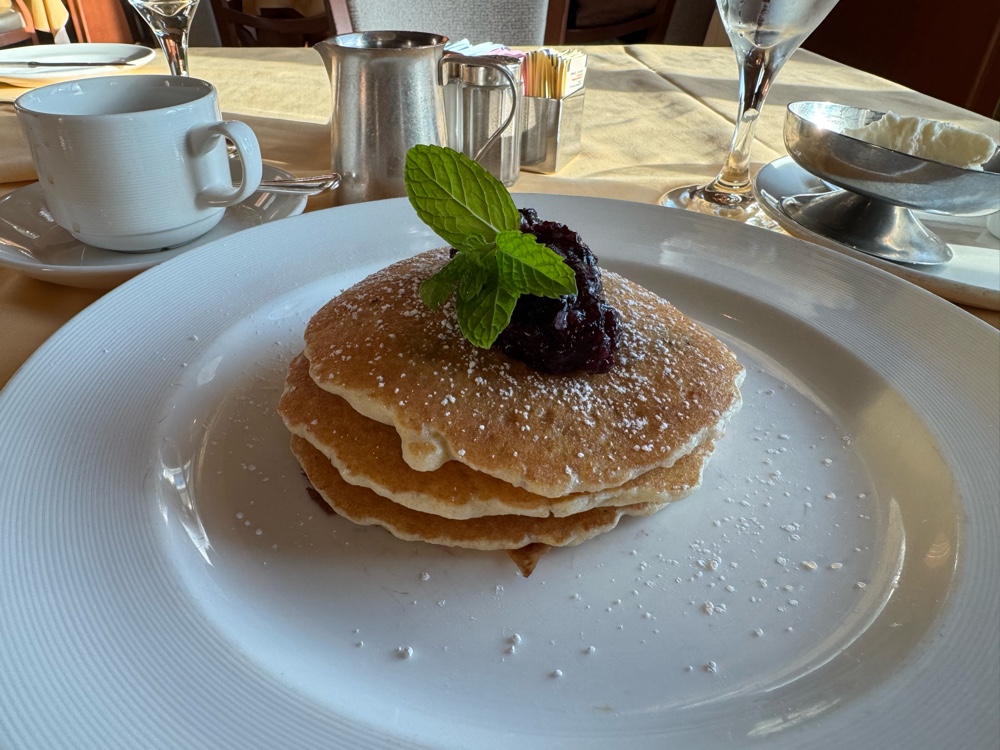 We went to breakfast in the Botticelli Dining Room (almost empty today), and discovered our next door table mates were from a development just ten miles from where we live. They’re both small towns; it’s a very small world. When the man asked what we were going to do today, G answered that he would do whatever his wife wanted to do. After I lifted my jaw back in to place, I asked our waiter for a special order: pancakes with (maybe? please?) just a couple of blueberries in them. I figured today might be a tough day, and needed my favorite breakfast comfort food to prepare.