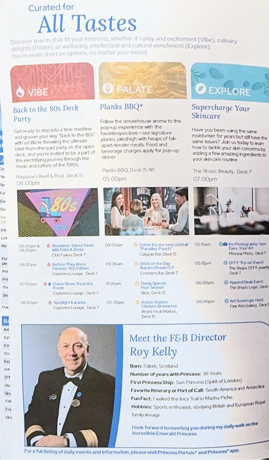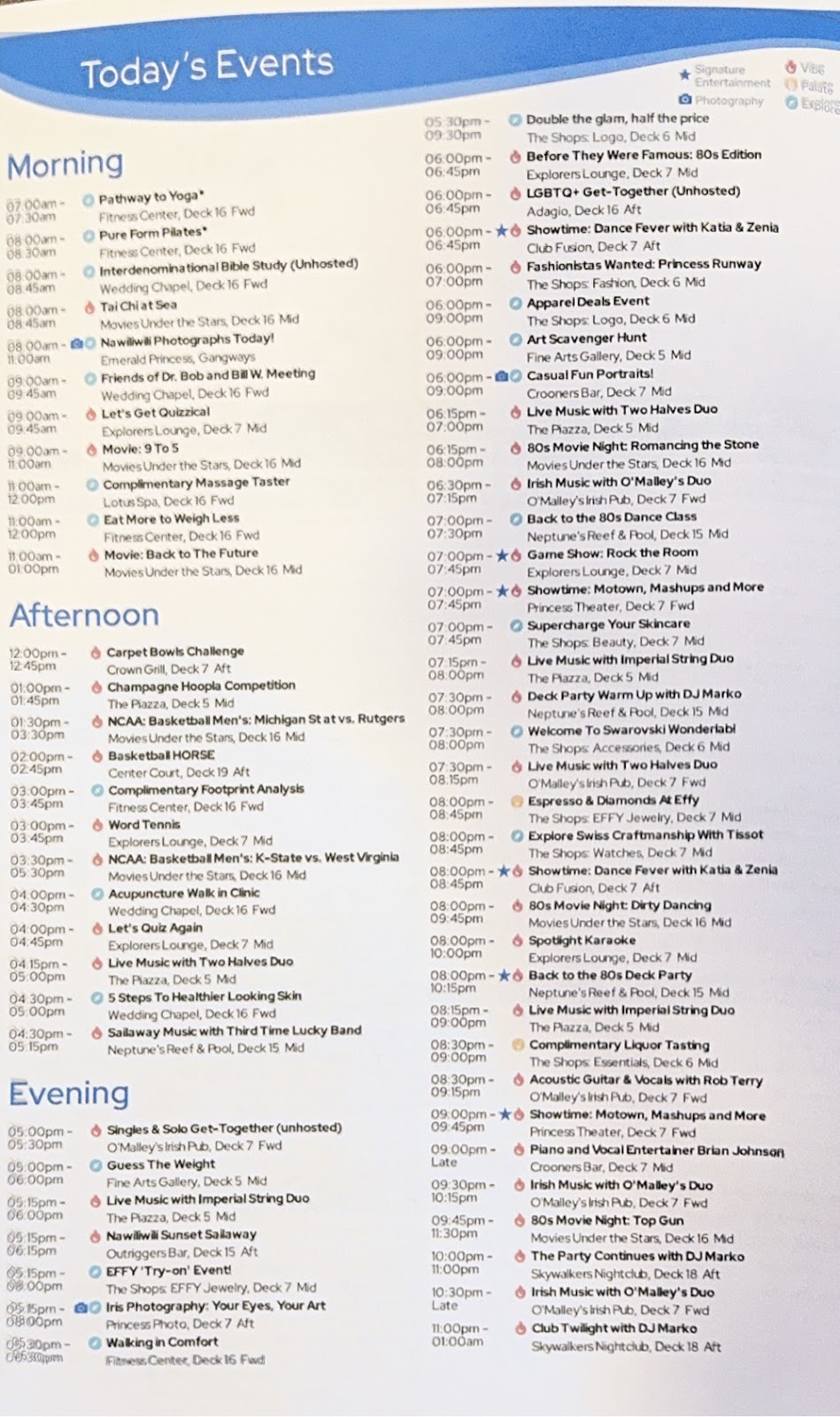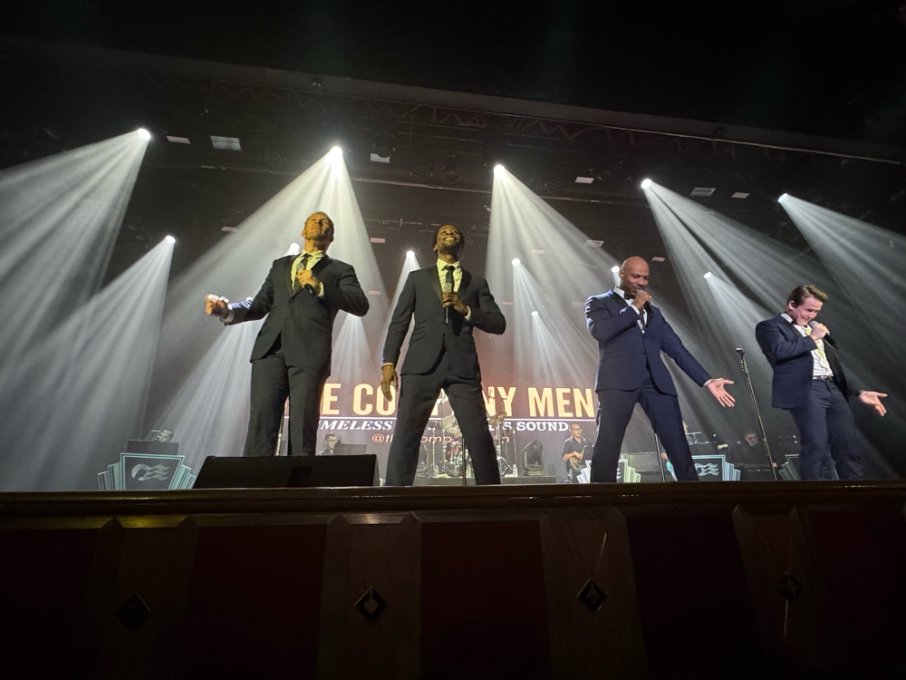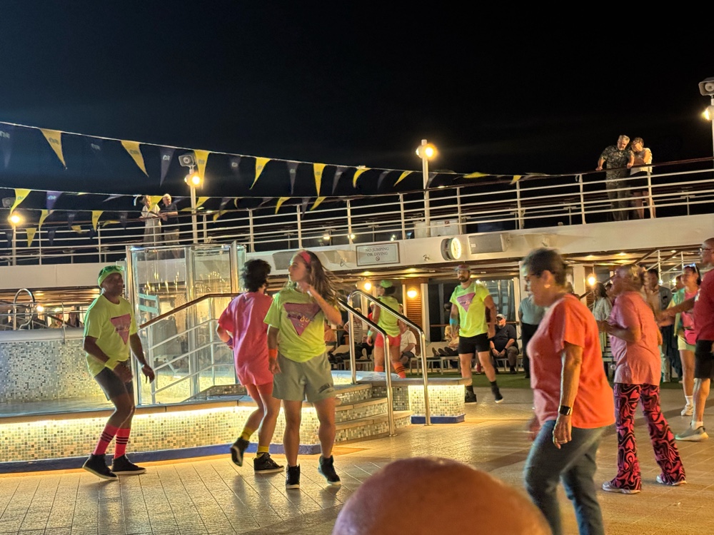 We made a last minute decision to go to the Princess Theater for tonight’s performance, The Company Men, back singing a Motown Mashup and More. I’m really glad we did. They were even better tonight (dstsnding O). Their collective vocal range is unbelievable. And then we went to the 80s party on the open deck, because it was literally just down the hall from our cabin.