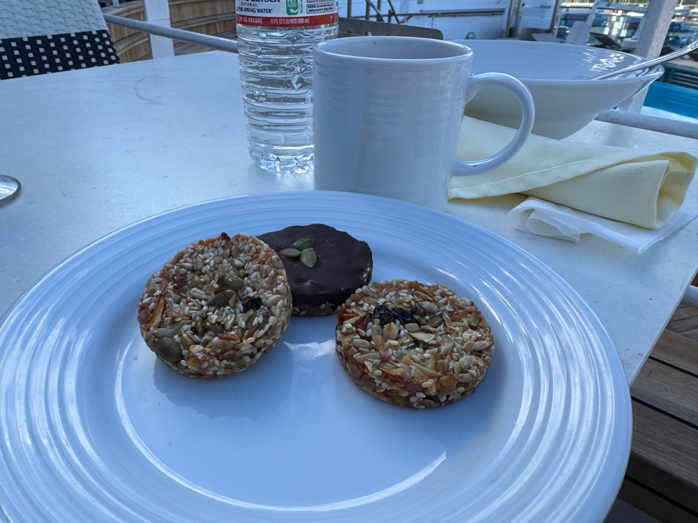 How I ever even fell asleep last night, all sweaty and salty and sticky from sweet drinks and greasy from sunscreen, is beyond me, but I guess I was just that tired. But a clean up was first in order this morning, and then I went to the International Cafe to pick up my favorite non-dining room breakfast food, nut and seed cakes that G calls bird food. I then took them upstairs to join him on the Terrace Deck where I was met by this amazing view.