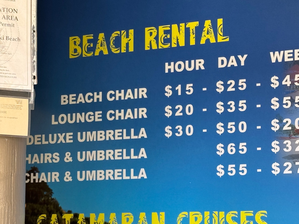 We packed for the day (more sunscreen, towels, etc) and walked off the ship and over to the ABC Store closest to the ship (a 10-minute walk or so) for beverages and then continued on to the Royal Sonesta Resort where we settled in on their beach, rented an umbrella and loungers ($65) and spent a few hours alternating between there and the beach bar.