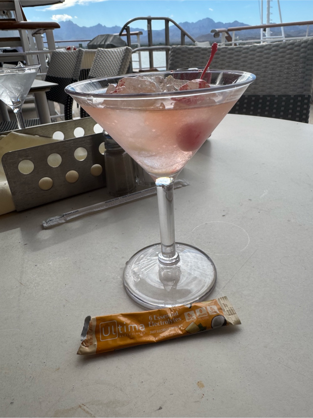 I needed to finish last night’s blog post and add photos to it and then met up with G again on the Terrace Deck, this time for lunch. It was nearly empty back there (this ship almost never feels crowded), and sitting there at a table half in the sun, half in the shade with a light breeze blowing and surrounded by gorgeous mountains was about as good as it gets.