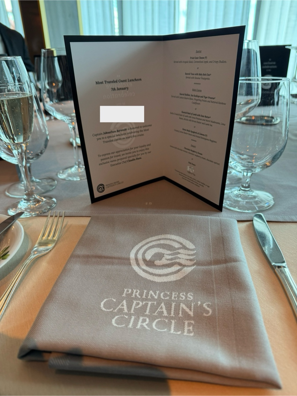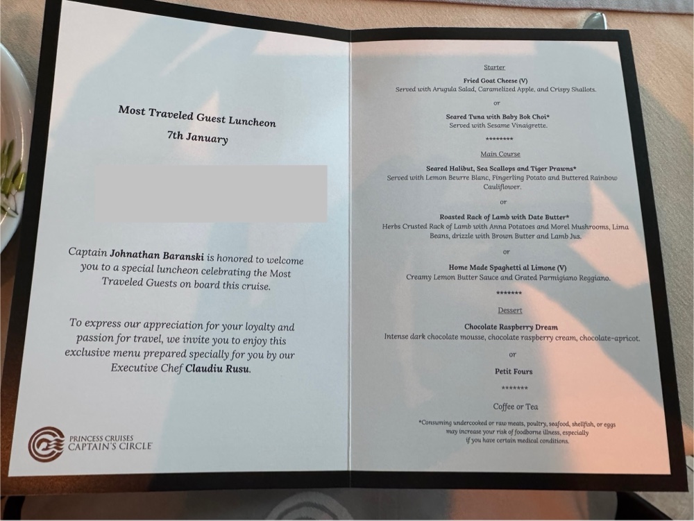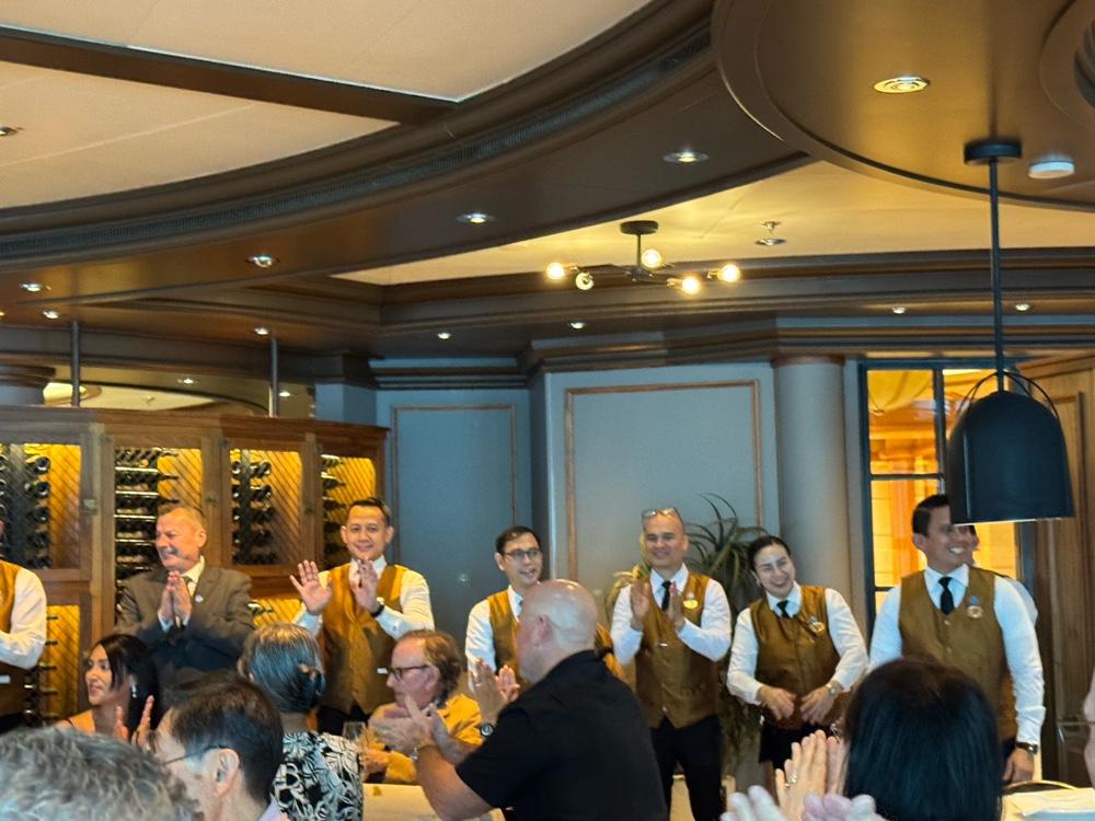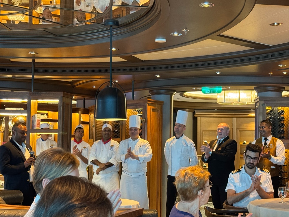 I returned to the cabin to finish yesterday’s blog post and get ready for our luncheon, which was scheduled to begin at 12:15pm in Sabatini’s. Our invitation told us to arrive early, which generally, on this ship and the Ruby Princess, means we’re going to start with champagne in the Adagio Lounge next door. And we did.
