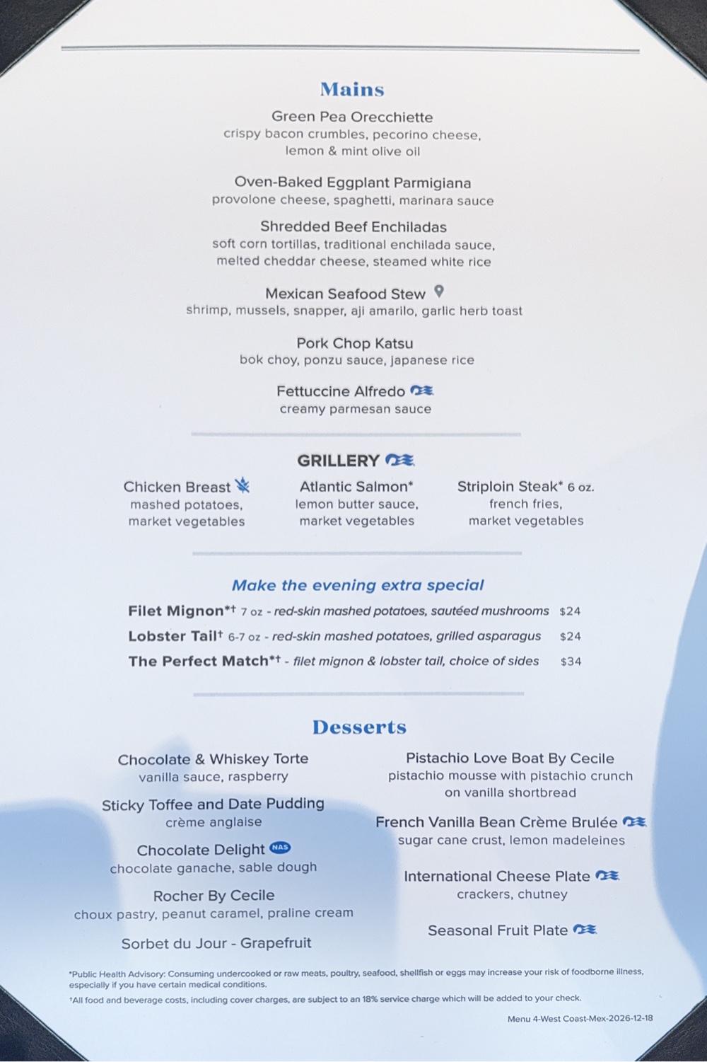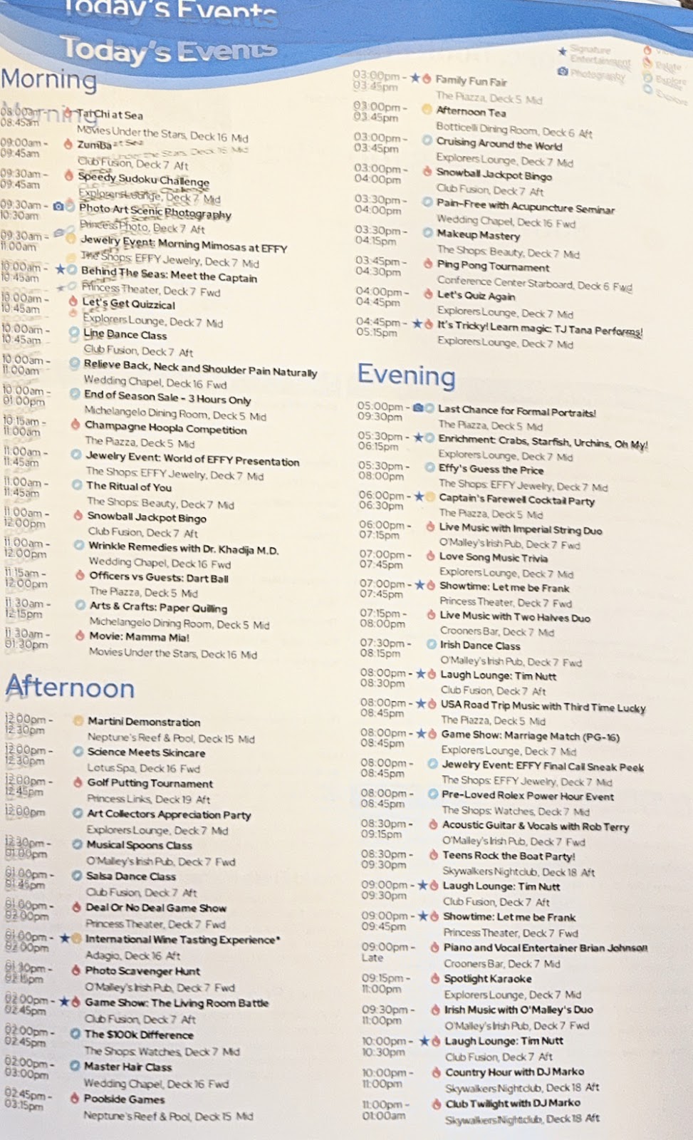 We followed that with comedian Tim Nutt in Club Fusion’s Laff Lounge, then swung into the buffet for coffee/ tea, and had an early bedtime. Tomorrow is the last day of this cruise. It’s been a good one with perfect weather, though it’s gotten just slightly bouncy tonight (we are at the very back of the ship). Captain Baranski told us at lunch to expect this overnight and tomorrow and we’re ready for it. It’s been hard to know we’ve even been at sea this cruise!