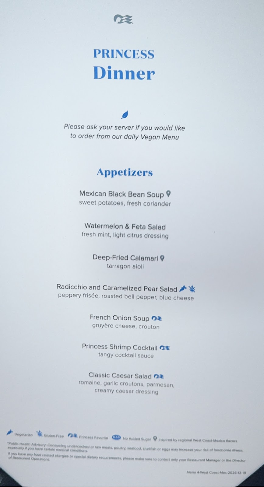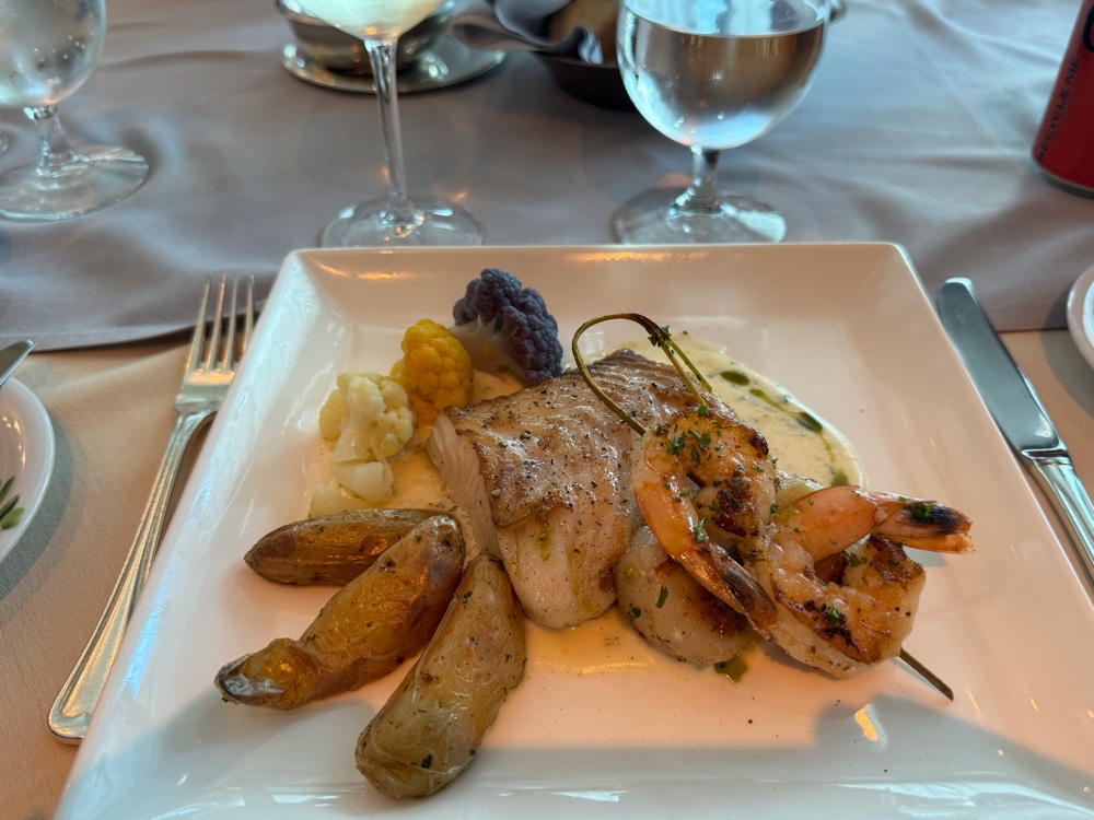 MTG luncheon always ruins us does the rest of the afternoon, so we took a nap in our cabin, dressed up a little for formal night and went to the Elite Lounge (just crudités) followed by dinner with Baran in the Michelangelo Dining Room. Appetite has nothing to do with it at this point. But we did eat lightly (watermelon and feta and Mexican seafood stew aka Bering Strait Stew on an Alaska cruise and cioppino on a Mediterranean cruise 😉).
