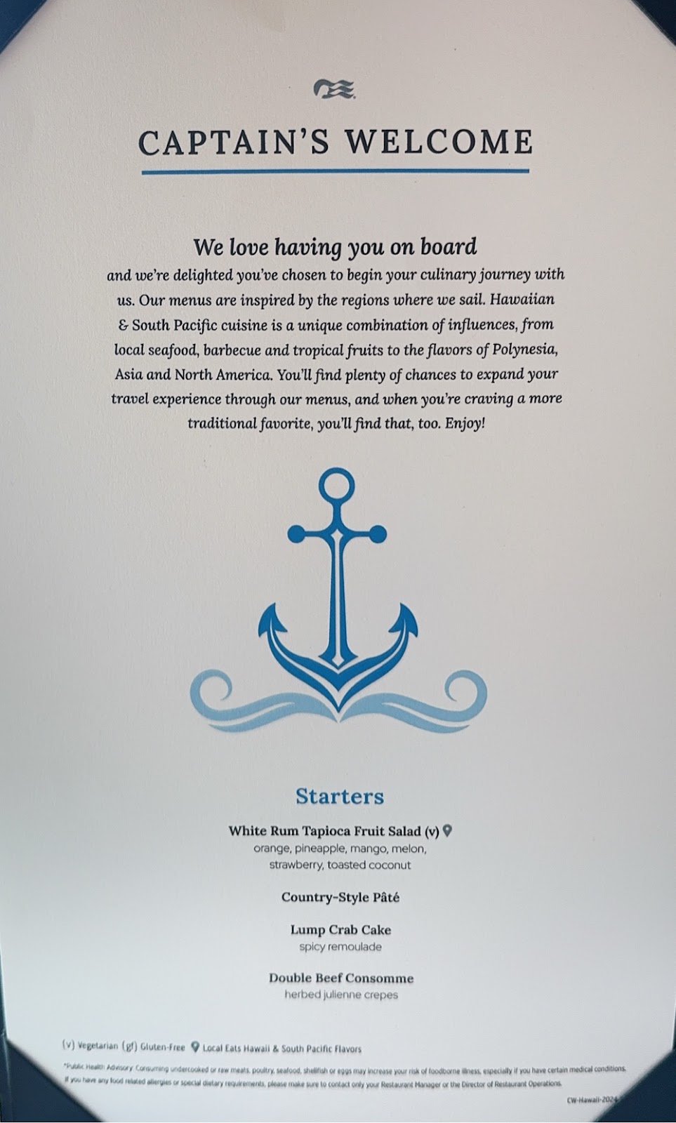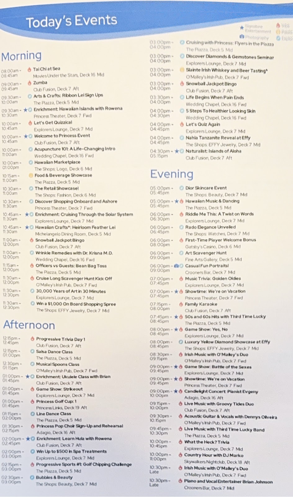 Our ukulele class is moving along quickly, and today we played two four-chord songs. I am no longer struggling over the G7 chord, but still choke when I have to go between G7 and G. Thankfully, my finger tips are getting used to the pressure of playing. We found out today that our MTG luncheon won’t take place until after the Hawaiian ports, which means I won’t miss the same lesson I missed last cruise. That’s a plus; I felt like I never caught up to the rest of the class.