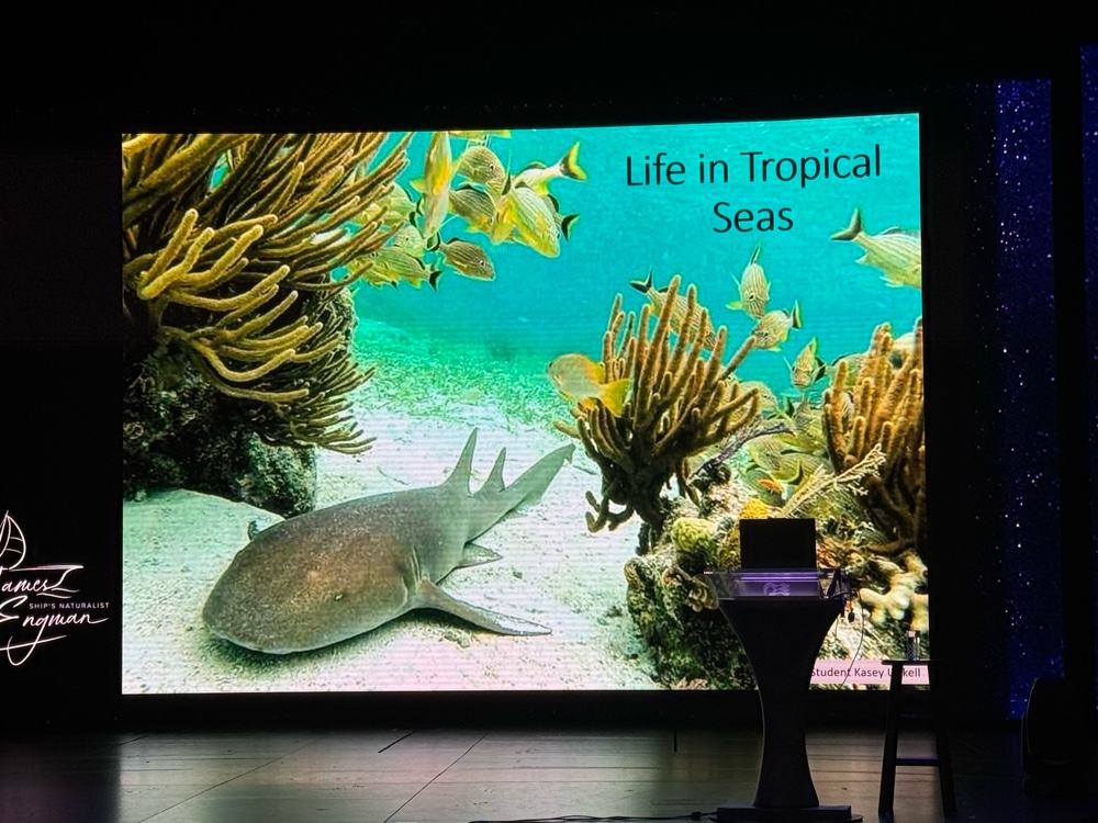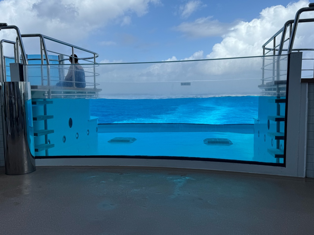 We were up on deck for the sailway party (a lot of fun, begging more comparisons to Carnival) and then watched as we sailed out of the Piet Everglades Inlet into the open ocean. It’s been at least ten years since we’ve done that (I kind of swore off Florida for awhile which, considering we once contemplated moving there is saying something). And I actually teared up for a minute remembering how much Mom used to love watching us on the Port Everglades webcam as we left on our cruises.