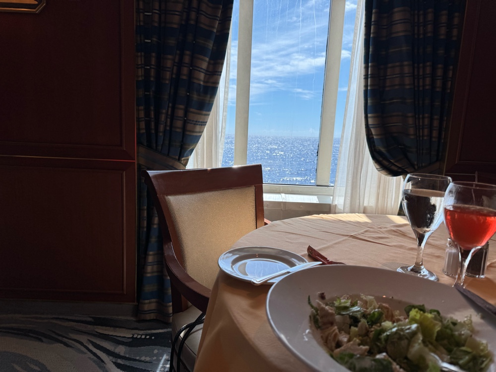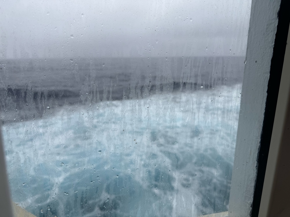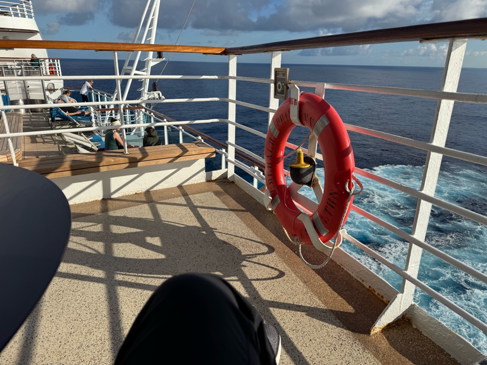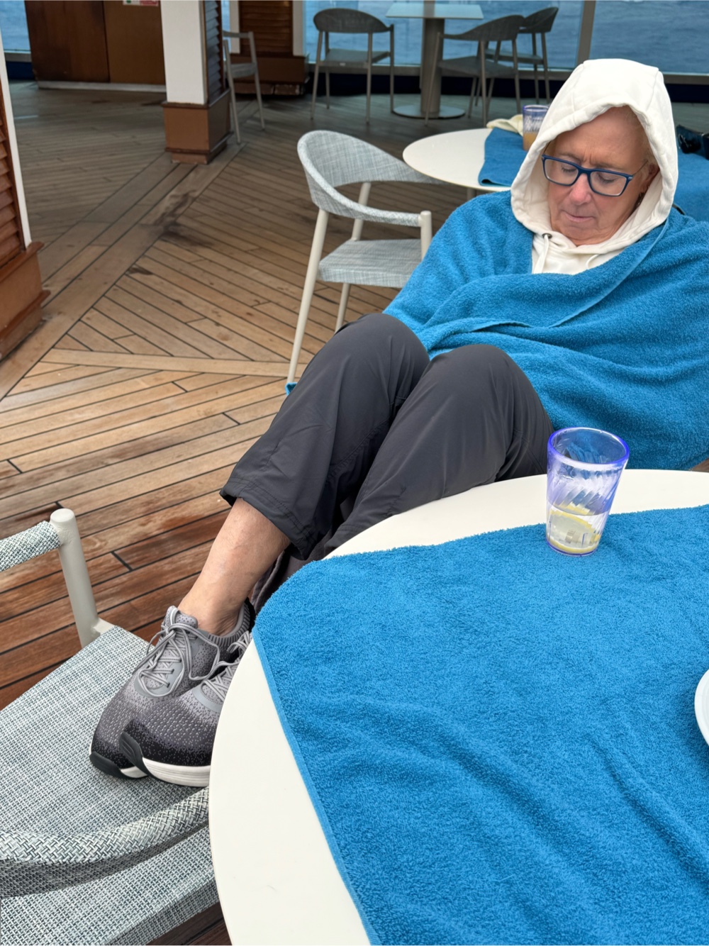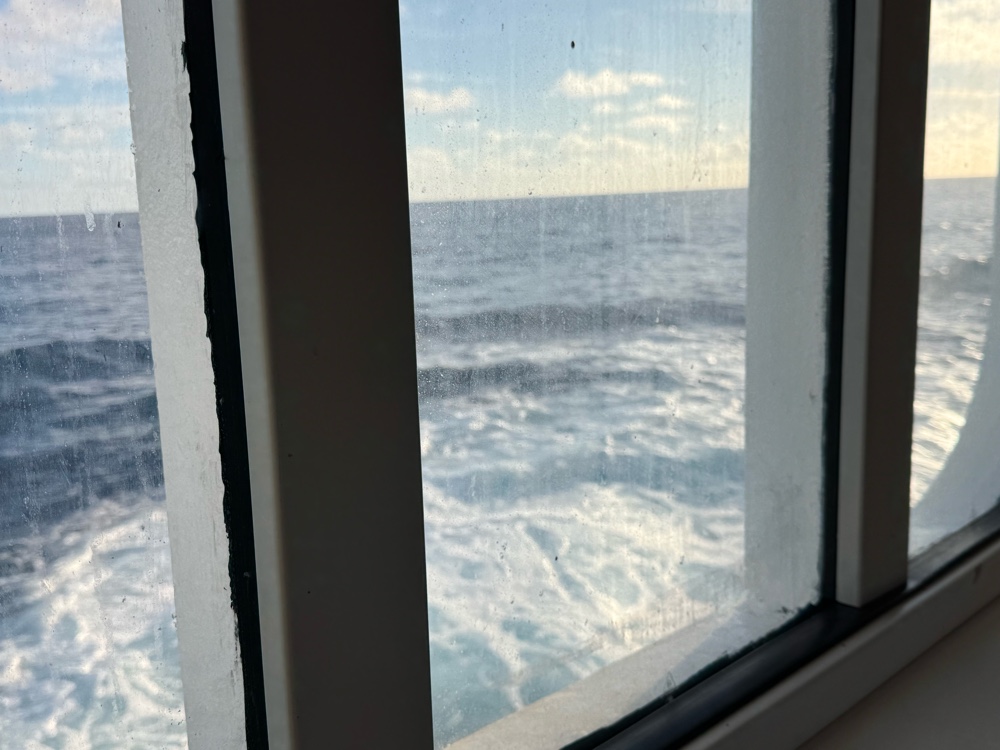 But I didn’t know that yet at 6am. I also didn’t know what the day’s temps would be, but it didn’t matter; our cabin is literally right under the Calypso Pool area so we’d be close for clothing changes. More accurately, our cabin is literally next to the Calypso Pool, along side the pool walls. The swells had returned overnight, and, because the pools had been filled during yesterday’s reprieve, we heard heavy sloshing all night long. It was exactly like sleeping on a beach, and wasn’t at all unpleasant…except for the eleventy-seven times I had to get up to use the bathroom during the night. The suggestive sound of moving water!