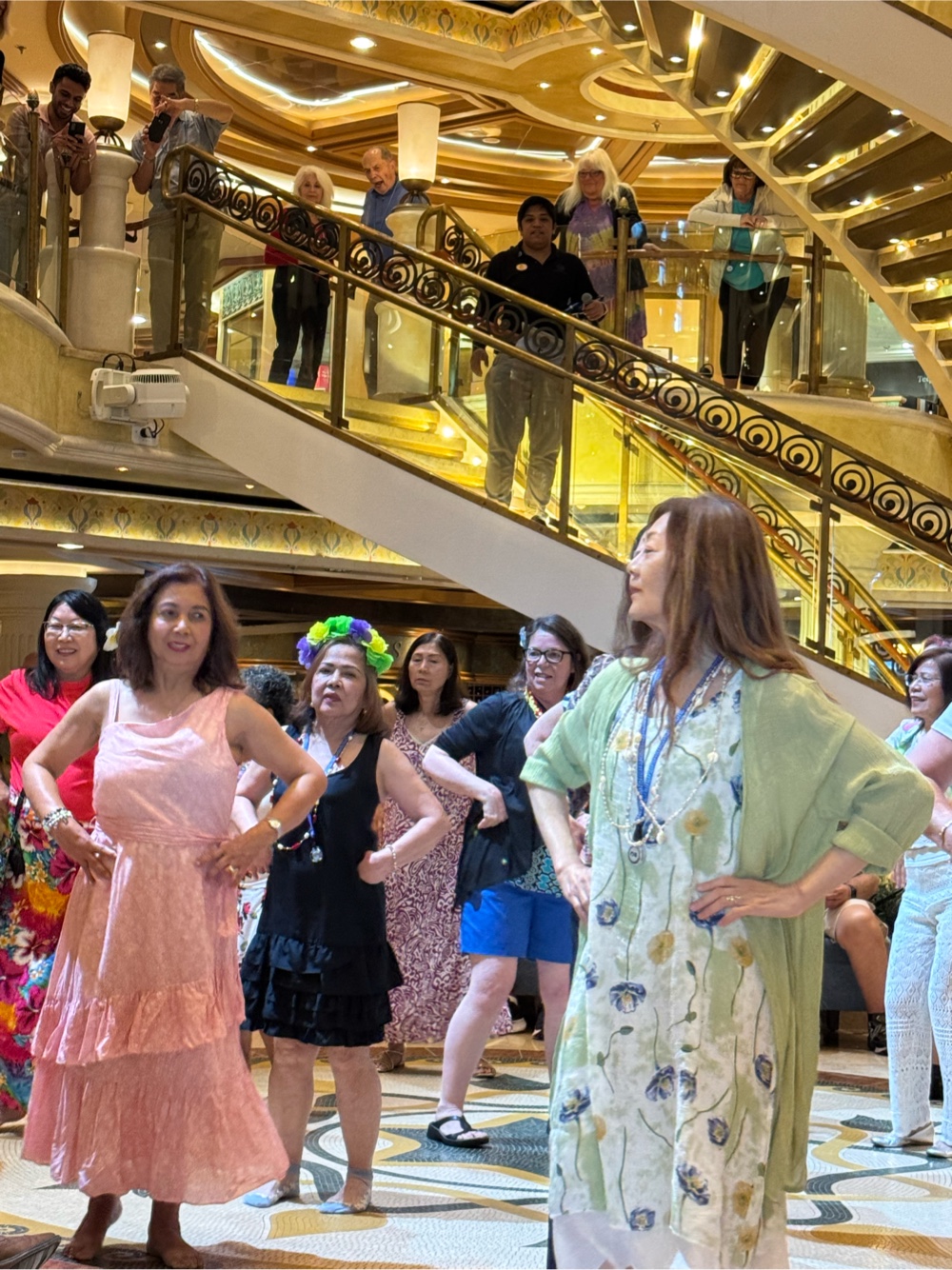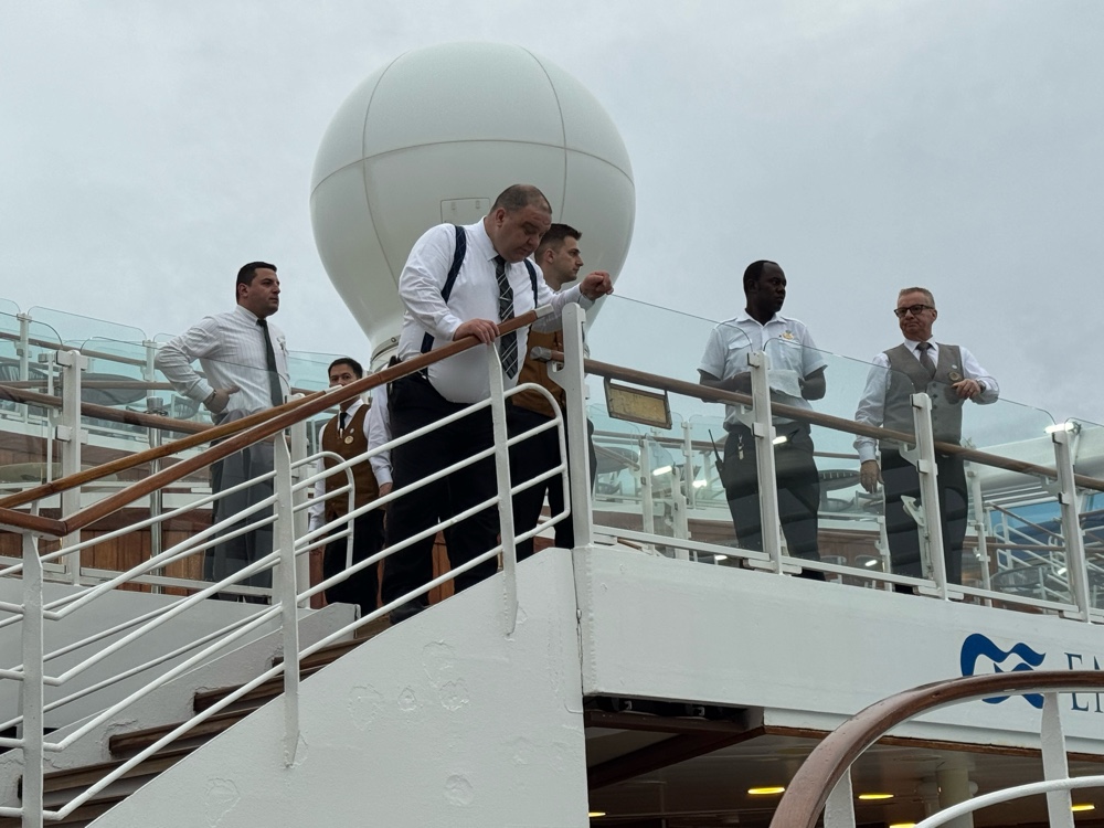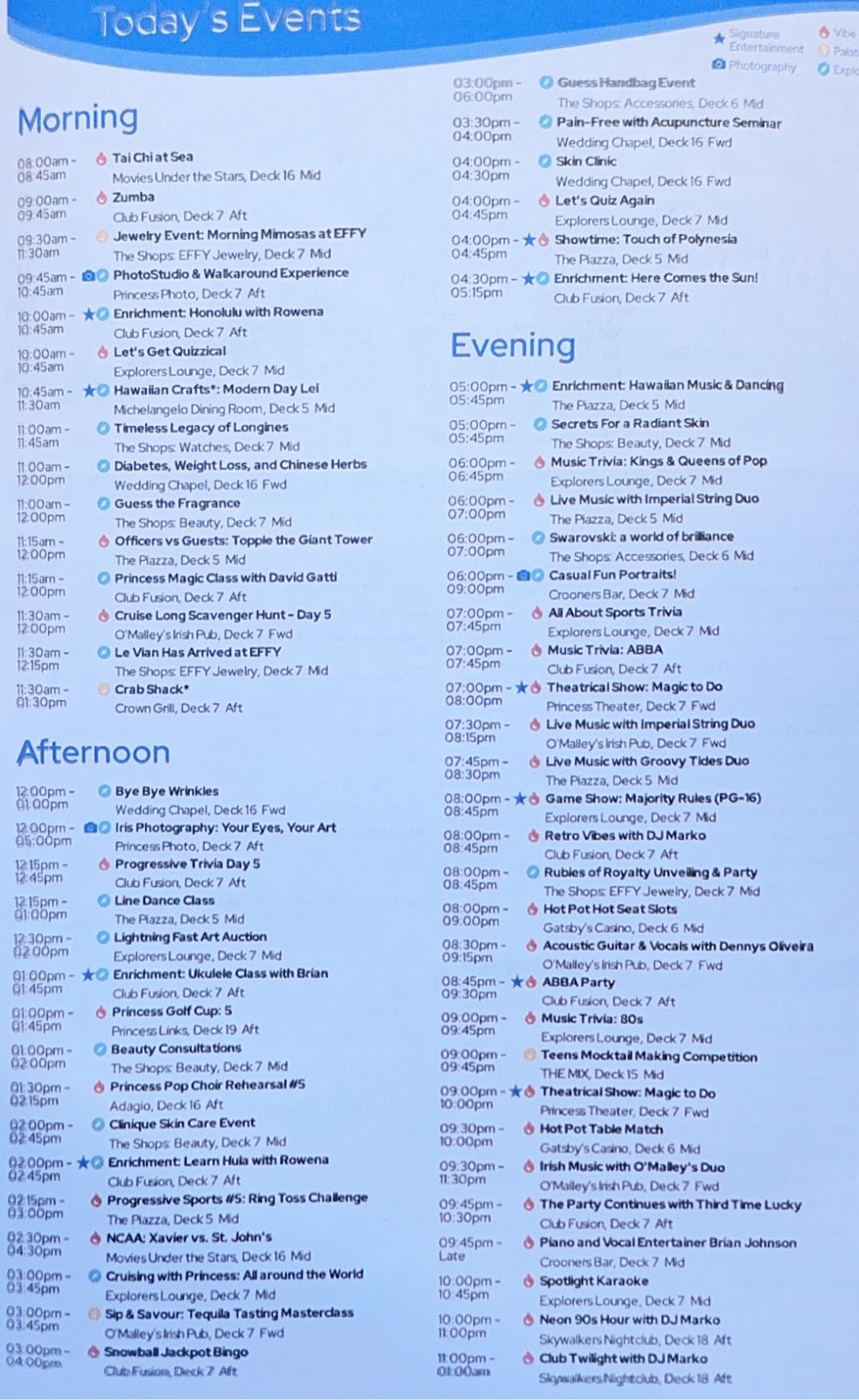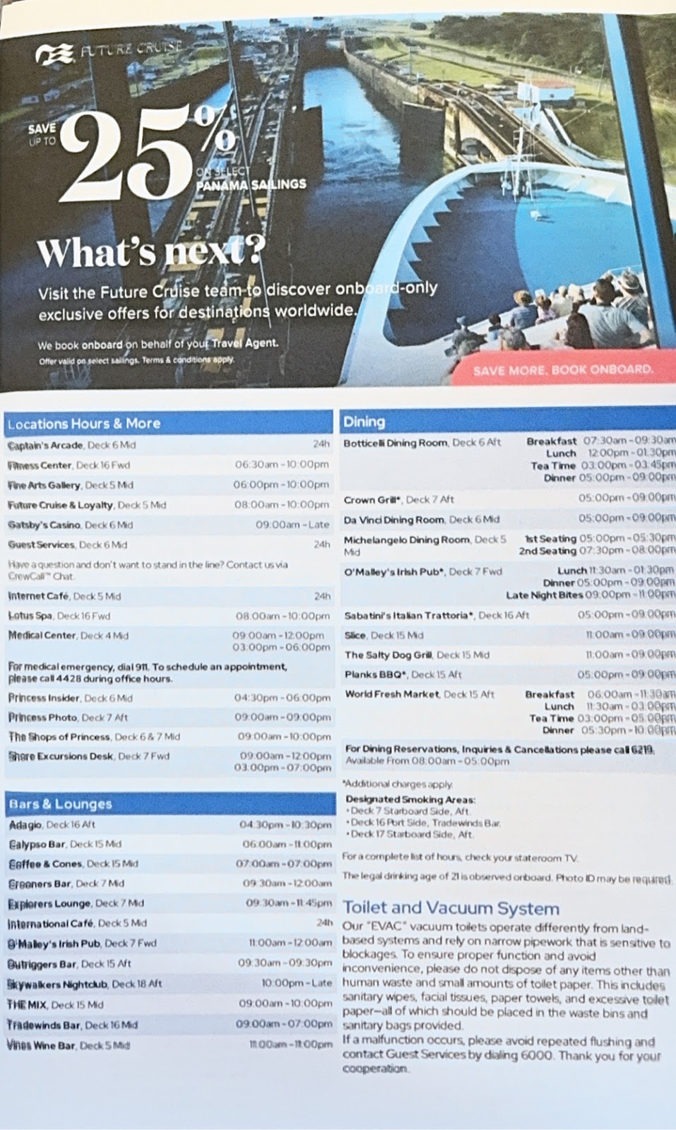 But I didn’t know that yet at 6am. I also didn’t know what the day’s temps would be, but it didn’t matter; our cabin is literally right under the Calypso Pool area so we’d be close for clothing changes. More accurately, our cabin is literally next to the Calypso Pool, along side the pool walls. The swells had returned overnight, and, because the pools had been filled during yesterday’s reprieve, we heard heavy sloshing all night long. It was exactly like sleeping on a beach, and wasn’t at all unpleasant…except for the eleventy-seven times I had to get up to use the bathroom during the night. The suggestive sound of moving water!