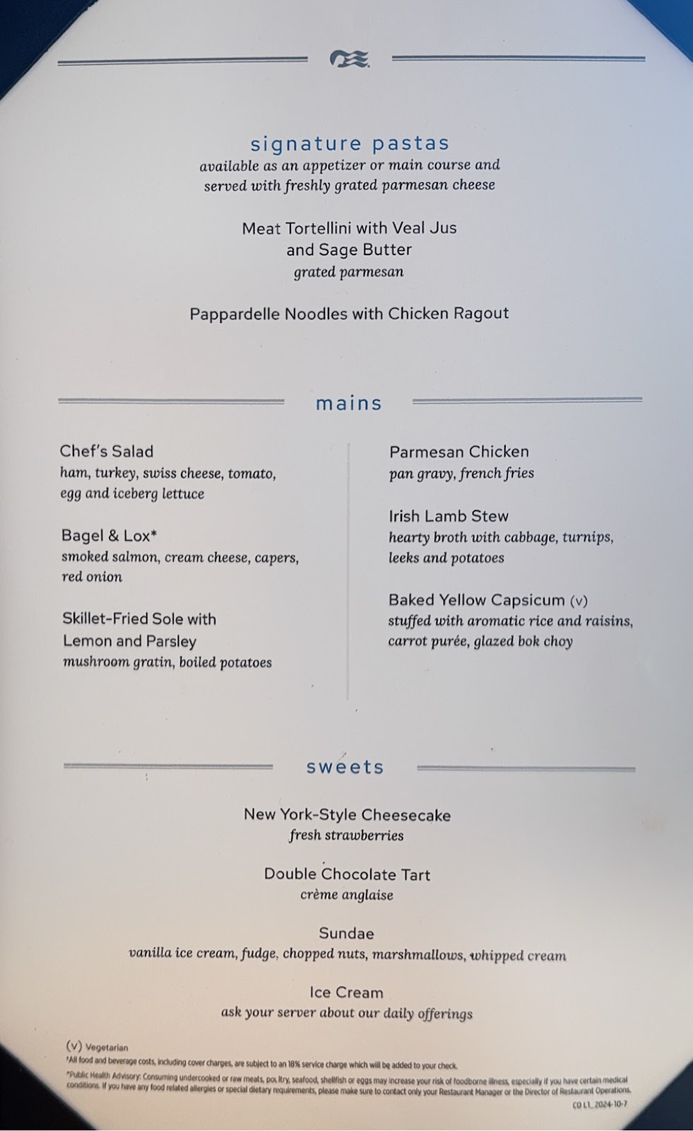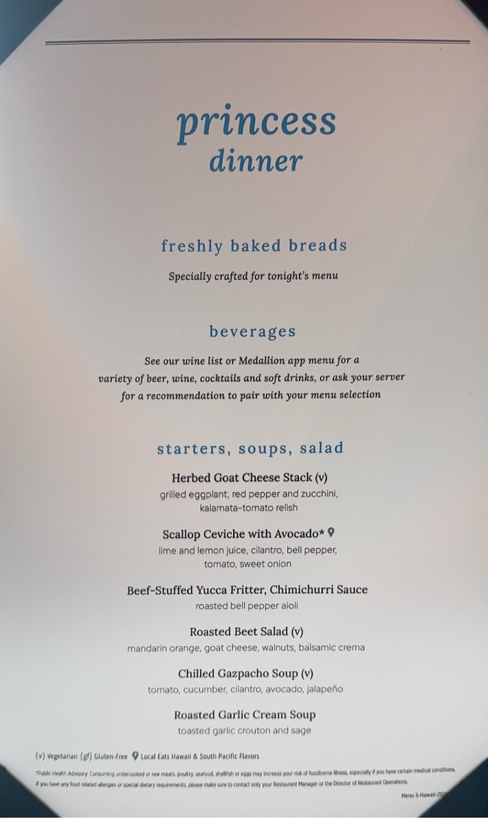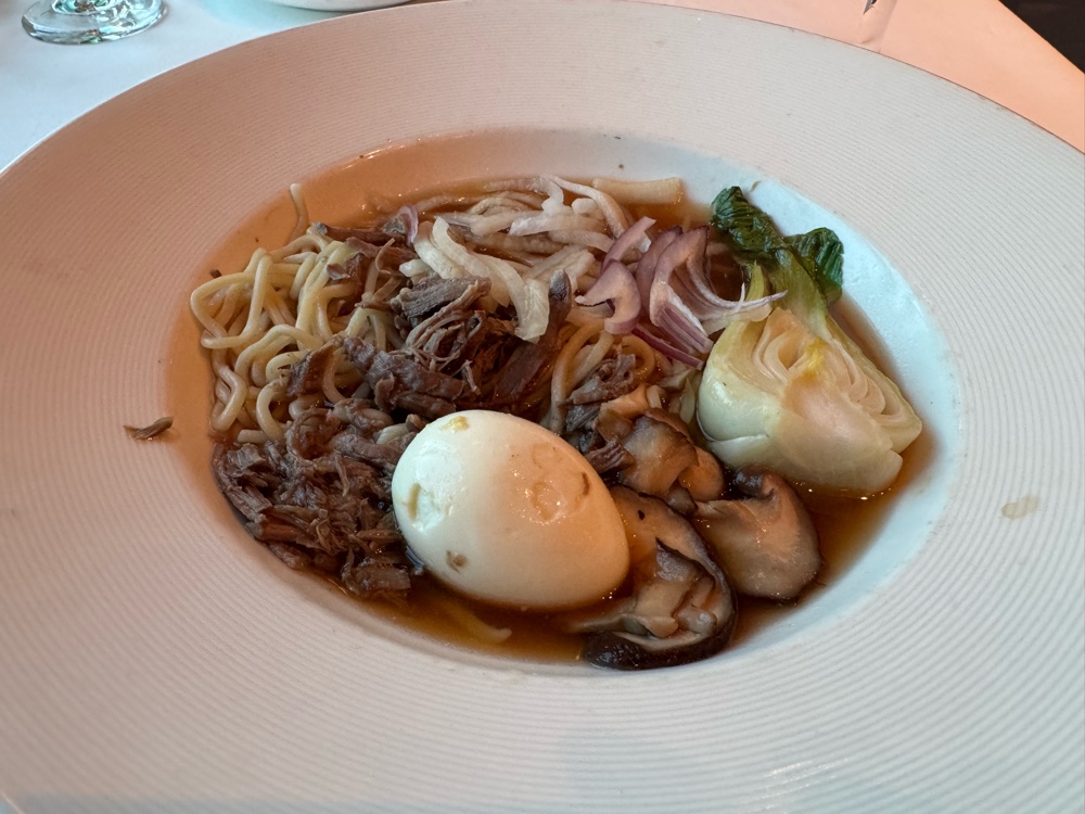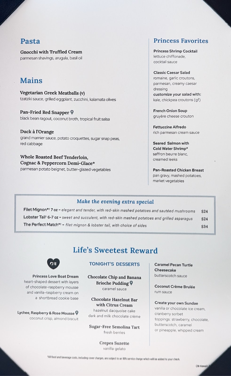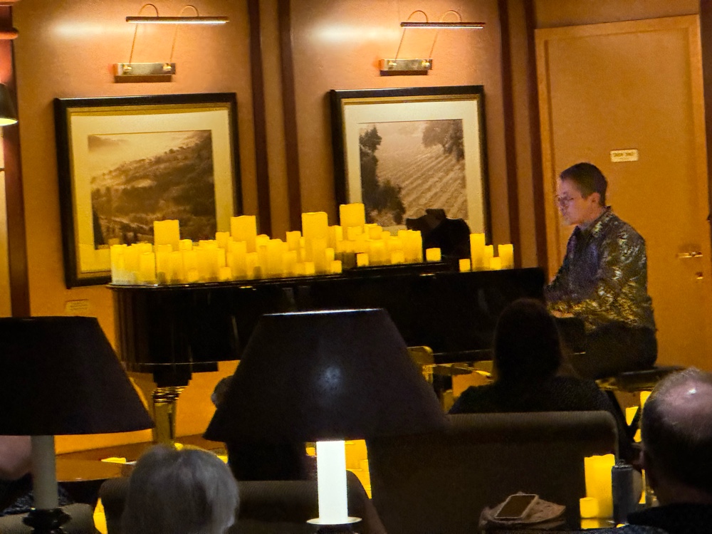 Then we returned to the Michelangelo Dining Room for the coffee and dessert we skipped to get good seats for the show. Our waiter Richard actually has an empty table for two at late dining, and that’s where we sat. It works well. We love Richard and Anthony. In fact all the waiters have been simply the best. Ivy, our junior waiter for two cruises saw me today and came running to give me a hug, and we can now count on the waiters to point out to one of us where the other is sitting in the buffet when we’re searching. This is the first time since COVID that we’ve cruised long enough for that to happen, and it brings back fond memories of Emerald Princess and Pacific Princess seasons from years ago.
