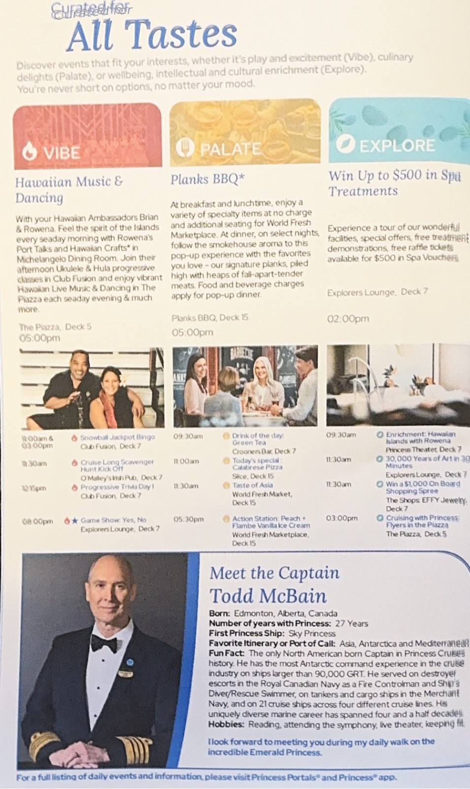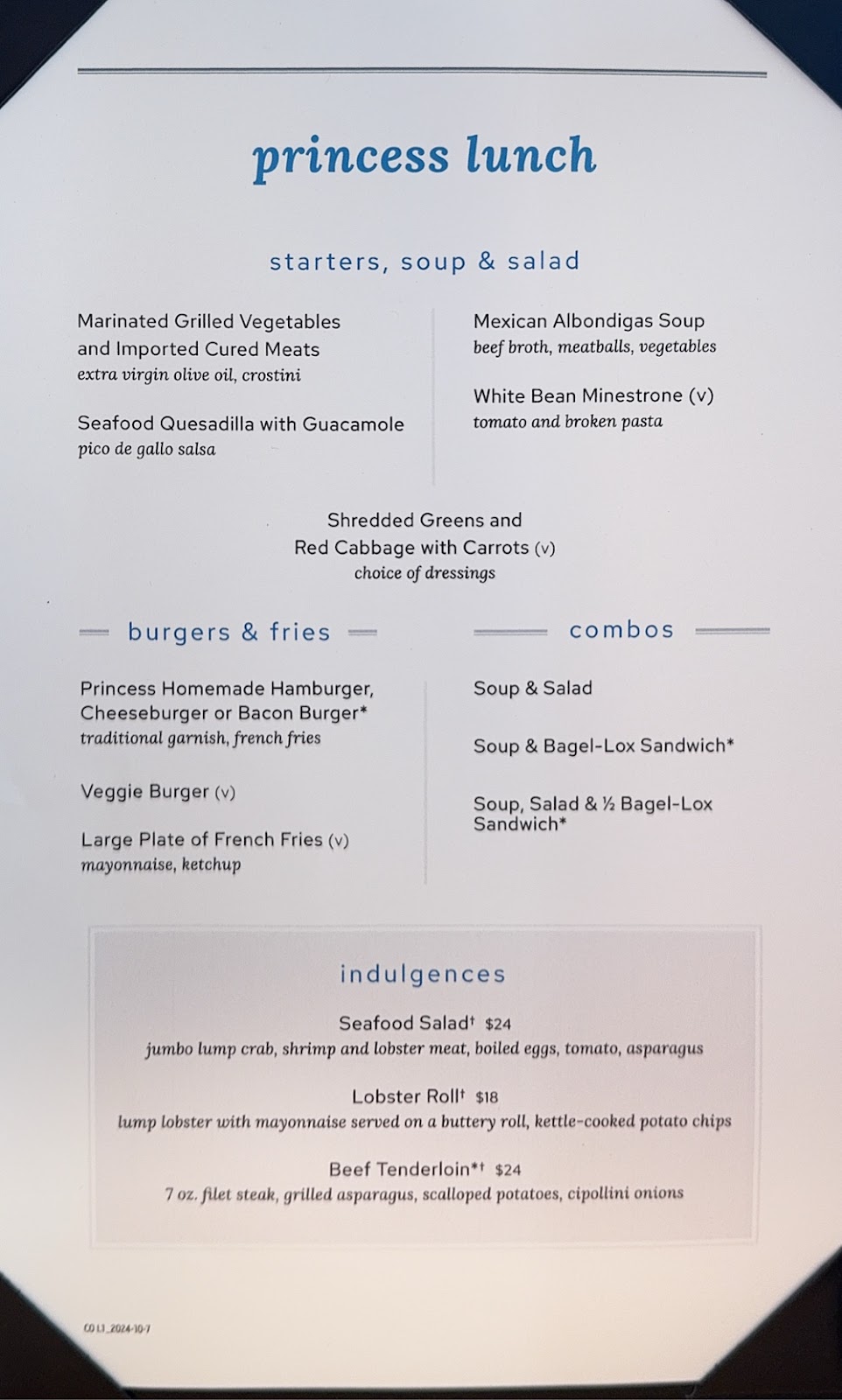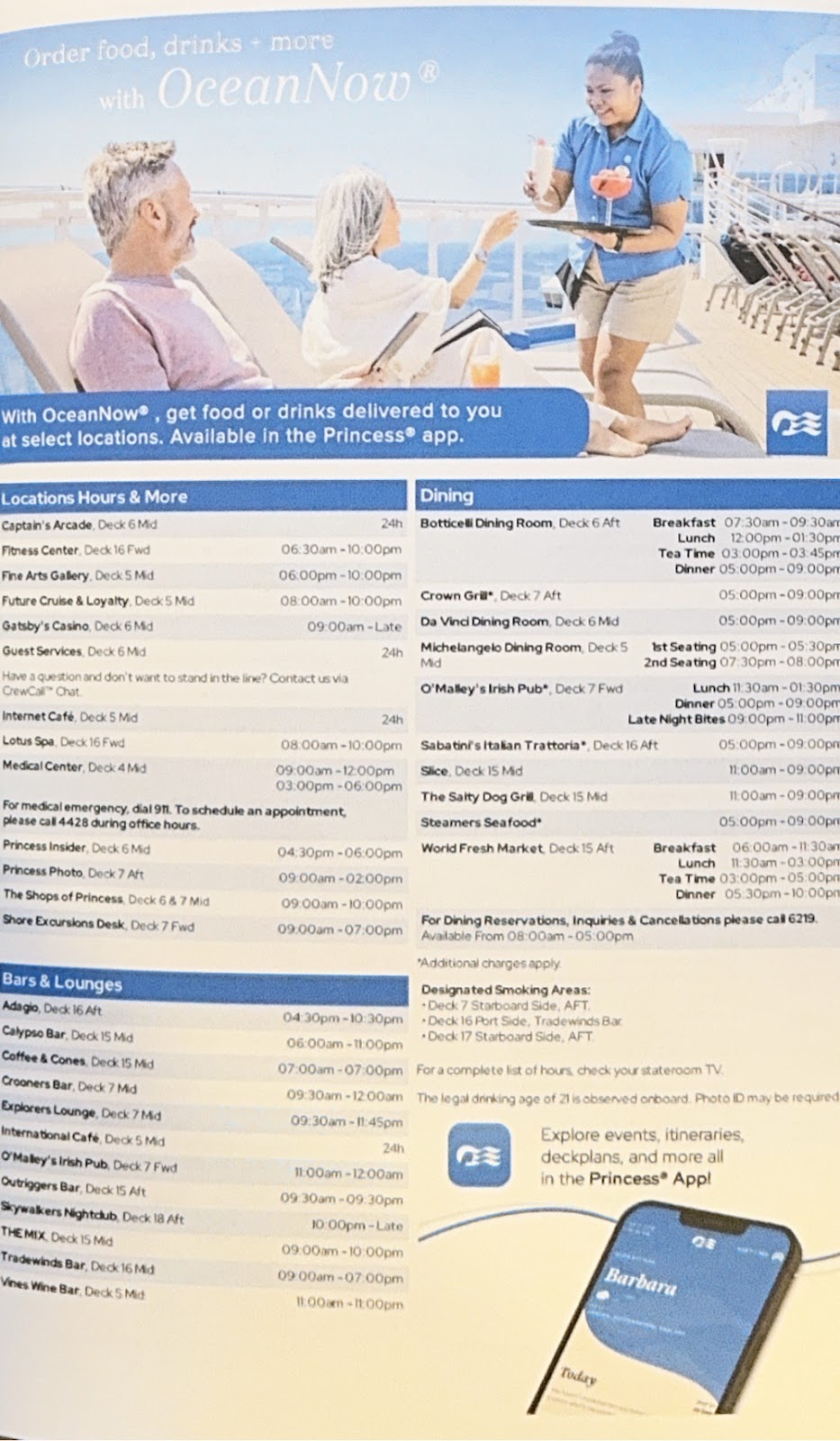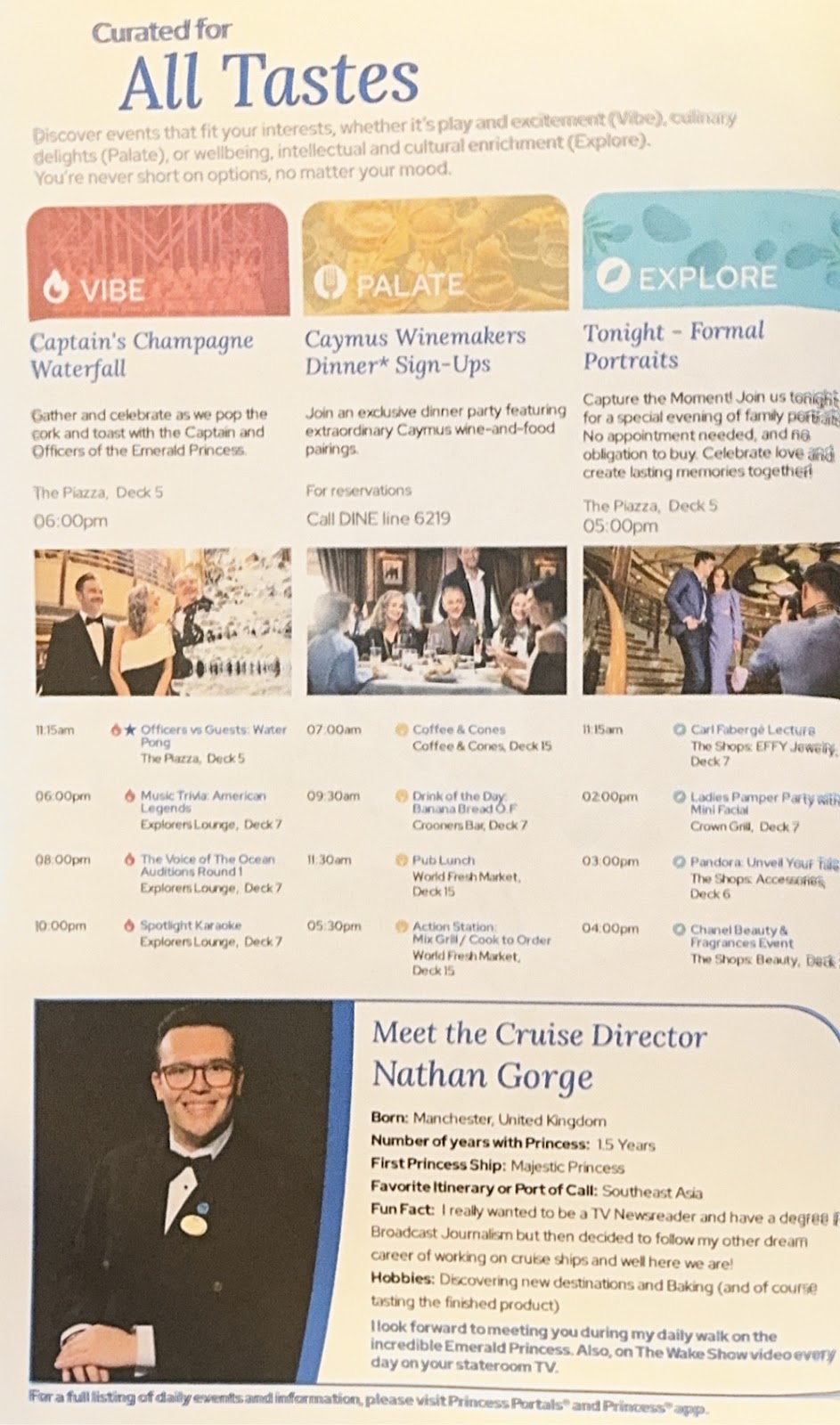Then we returned to the Michelangelo Dining Room for the coffee and dessert we skipped to get good seats for the show. Our waiter Richard actually has an empty table for two at late dining, and that’s where we sat. It works well. We love Richard and Anthony. In fact all the waiters have been simply the best. Ivy, our junior waiter for two cruises saw me today and came running to give me a hug, and we can now count on the waiters to point out to one of us where the other is sitting in the buffet when we’re searching. This is the first time since COVID that we’ve cruised long enough for that to happen, and it brings back fond memories of Emerald Princess and Pacific Princess seasons from years ago.