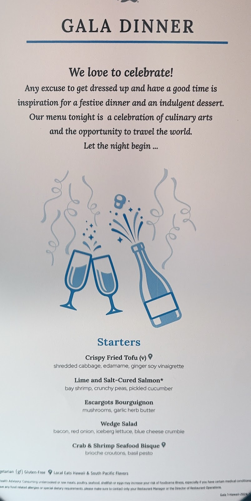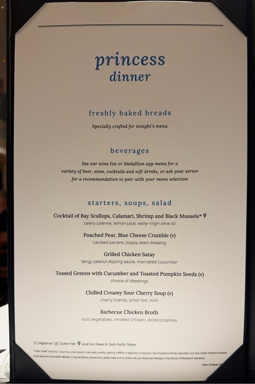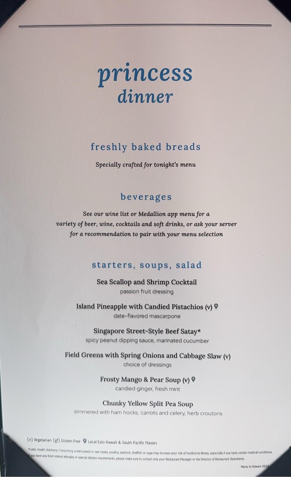We always enjoy the MTG luncheons, and not just for the delicious food and attentive service, but because we love chatting with the officer at our table (in our case, Captain McBain) and our table mates. It was comforting to hear the captain admit that, while last cruise might have painted a rosy picture about the weather we could expect on a Hawaiian cruise at this time of year, this cruise has been far worse than usual. And it’s not that the swells on any particular day were the worst we’ve ever seen (they weren’t); it’s the fact that they have been unrelenting. We booked this cruise again for next year just two weeks ago; this week I was ready to cancel it.