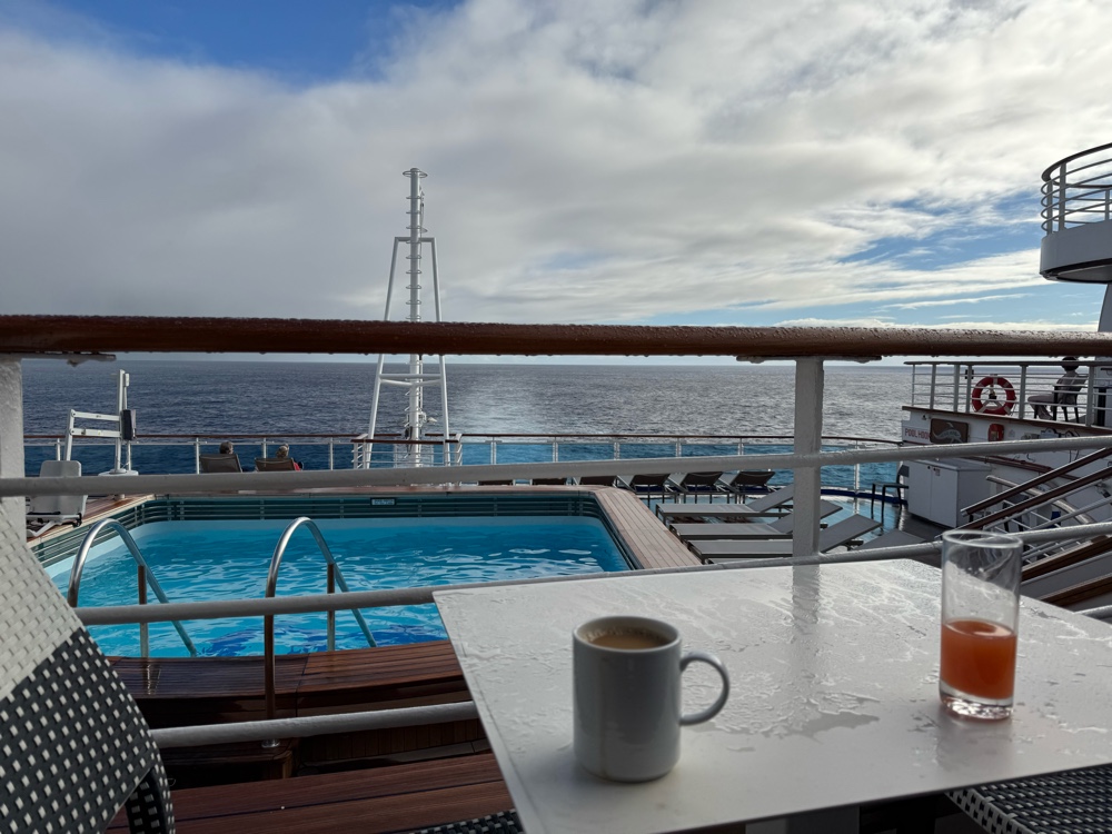 We both needed a rest after that, and I returned to the cabin for the first time in six hours to recharge my iPhone and me. I walked across Deck 15 on the outside of the ship and it was mostly cloudy and definitely cool, probably in the high 50s. These Hawaii cruises in January are generally cold for two days to/ from California, and this one is proving to be no exception. It definitely wasn’t pool or Sanctuary weather.