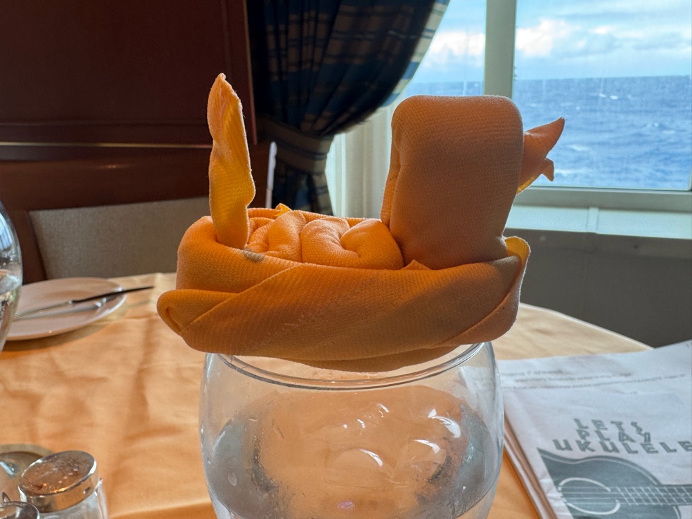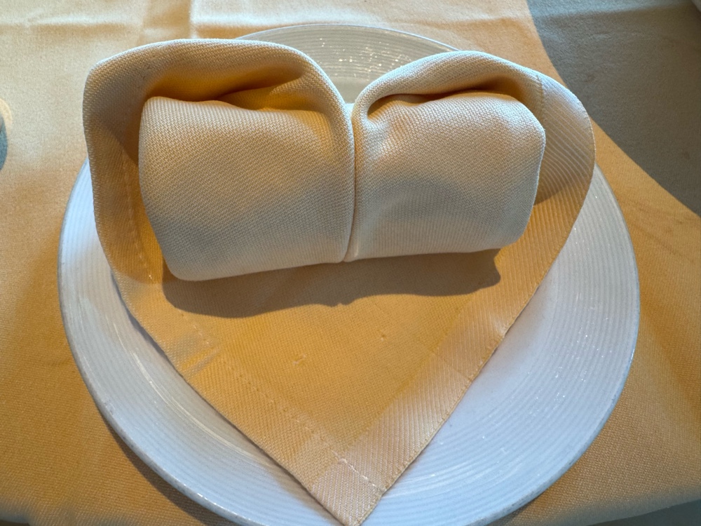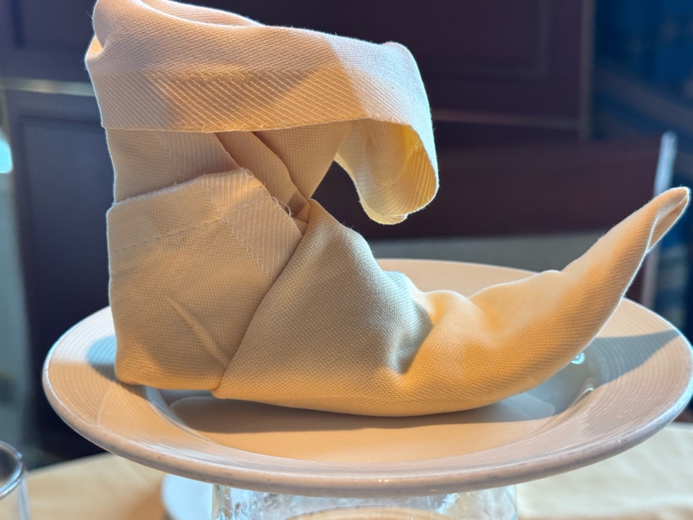 Waiter Romeo at lunch provided entertainment with his folded napkin creations. So clever!!