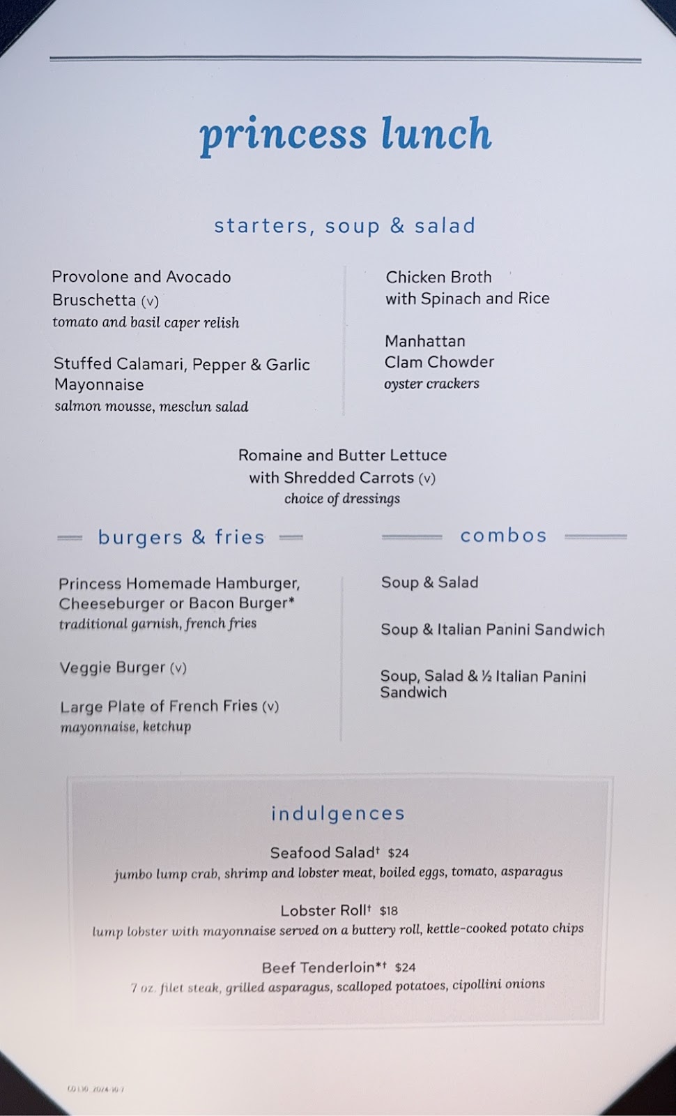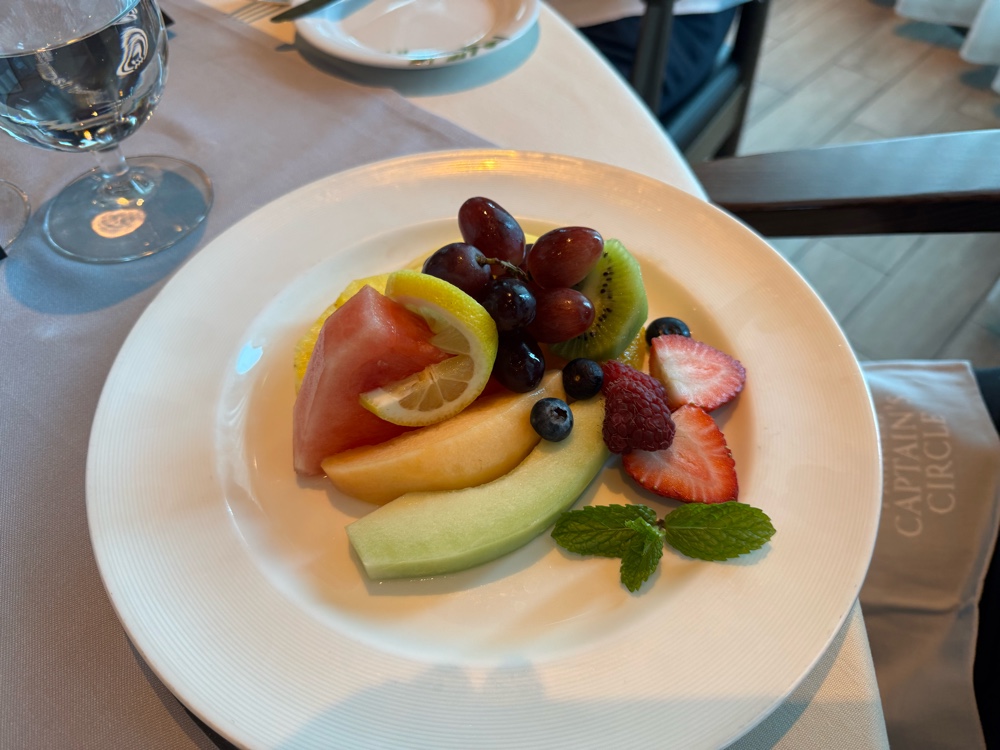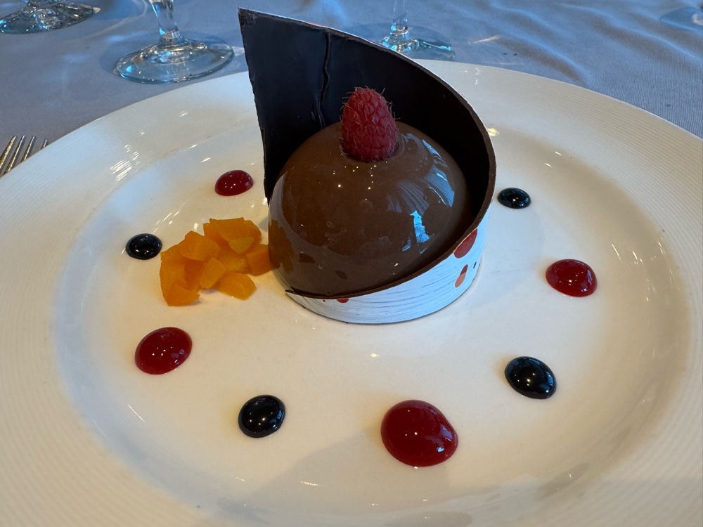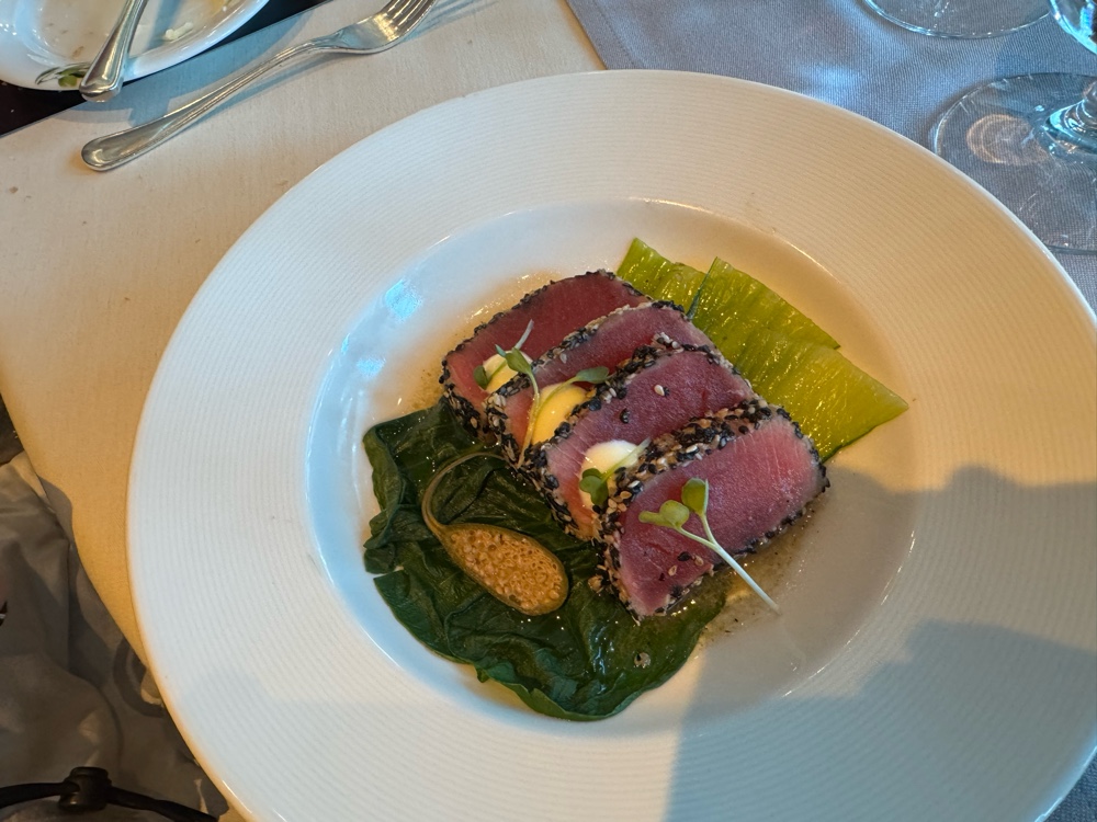 With that one hour ahead thing overnight, we were very slow to get moving this morning. Finally, at 10:30am I was the first to move. It was still bouncy, but slightly less so (at this point, we’ll take any improvement). Sleep has been difficult; we’re going to be playing catch up for days at home. We didn’t need breakfast; it was MTG luncheon day!