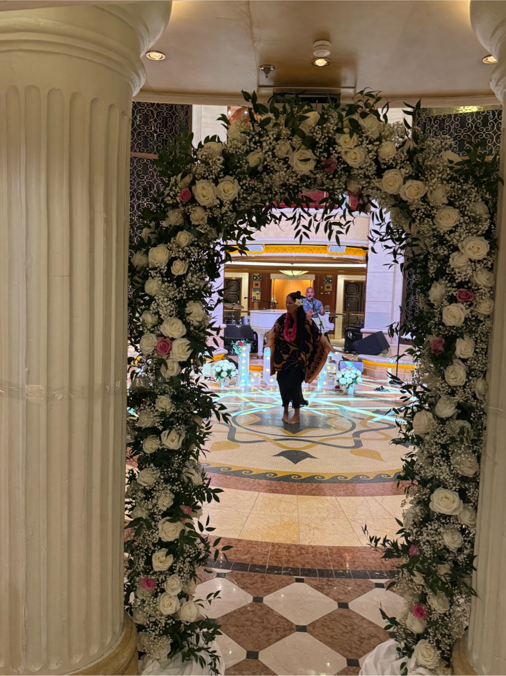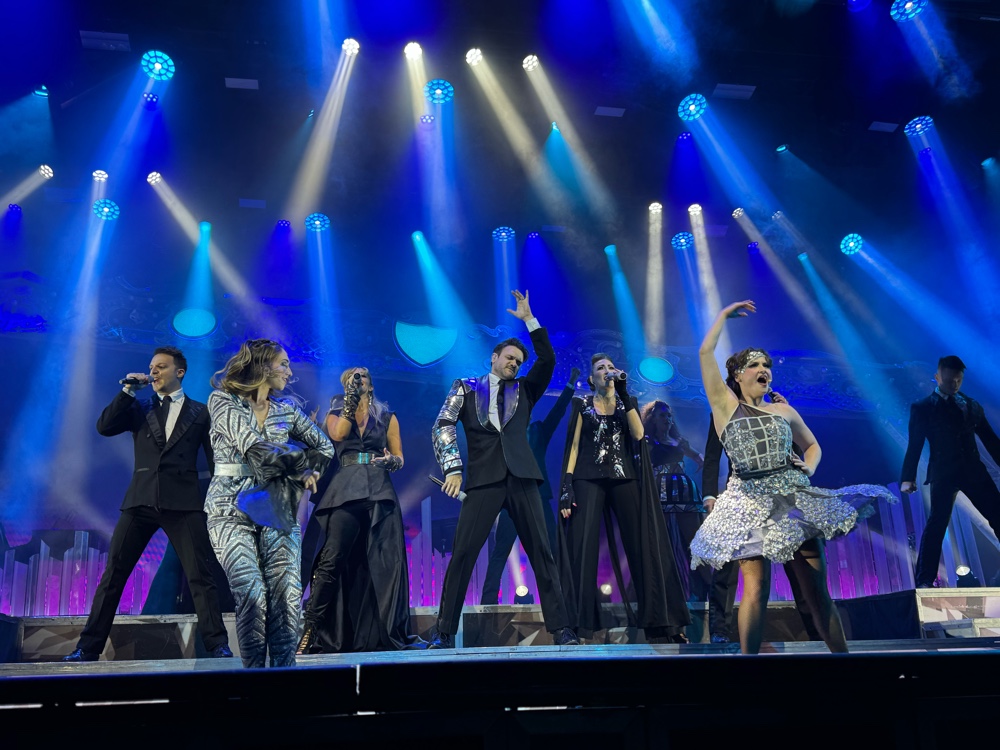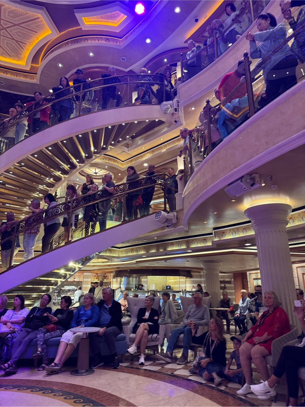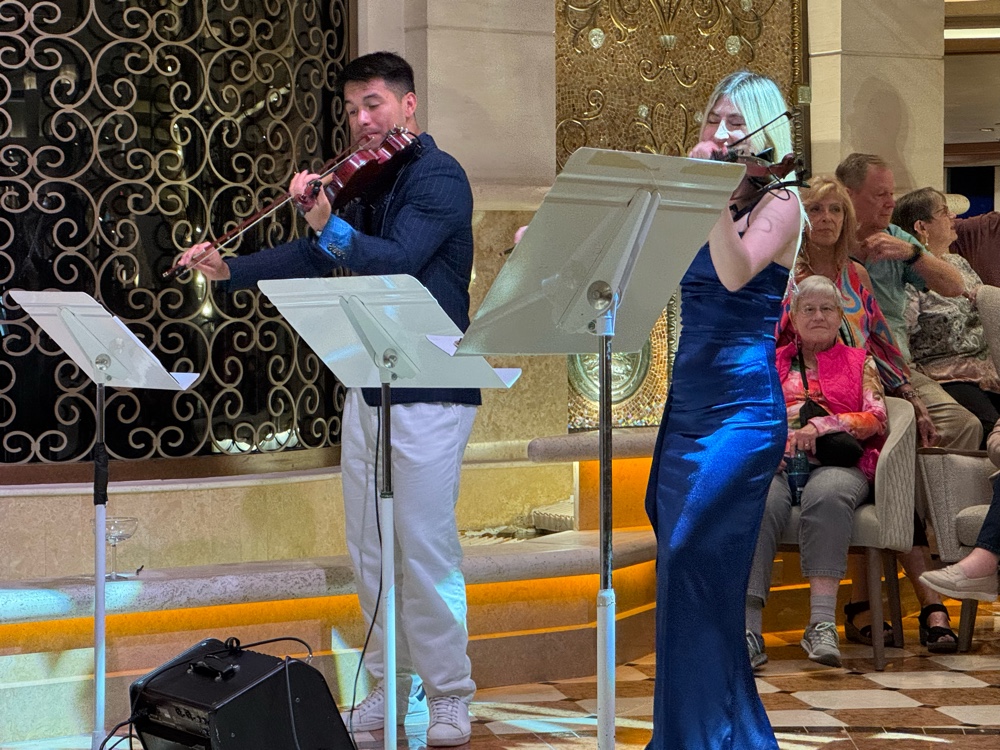 Tonight’s Princess Theater entertainment was a magician, so we went right to the Piazza where we snagged front row seats for tonight’s Princess World Orchestra. It was fun to watch them set up, especially since we know many of the musicians by now.
