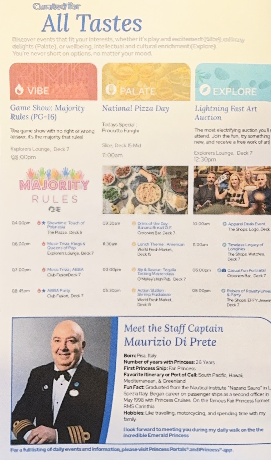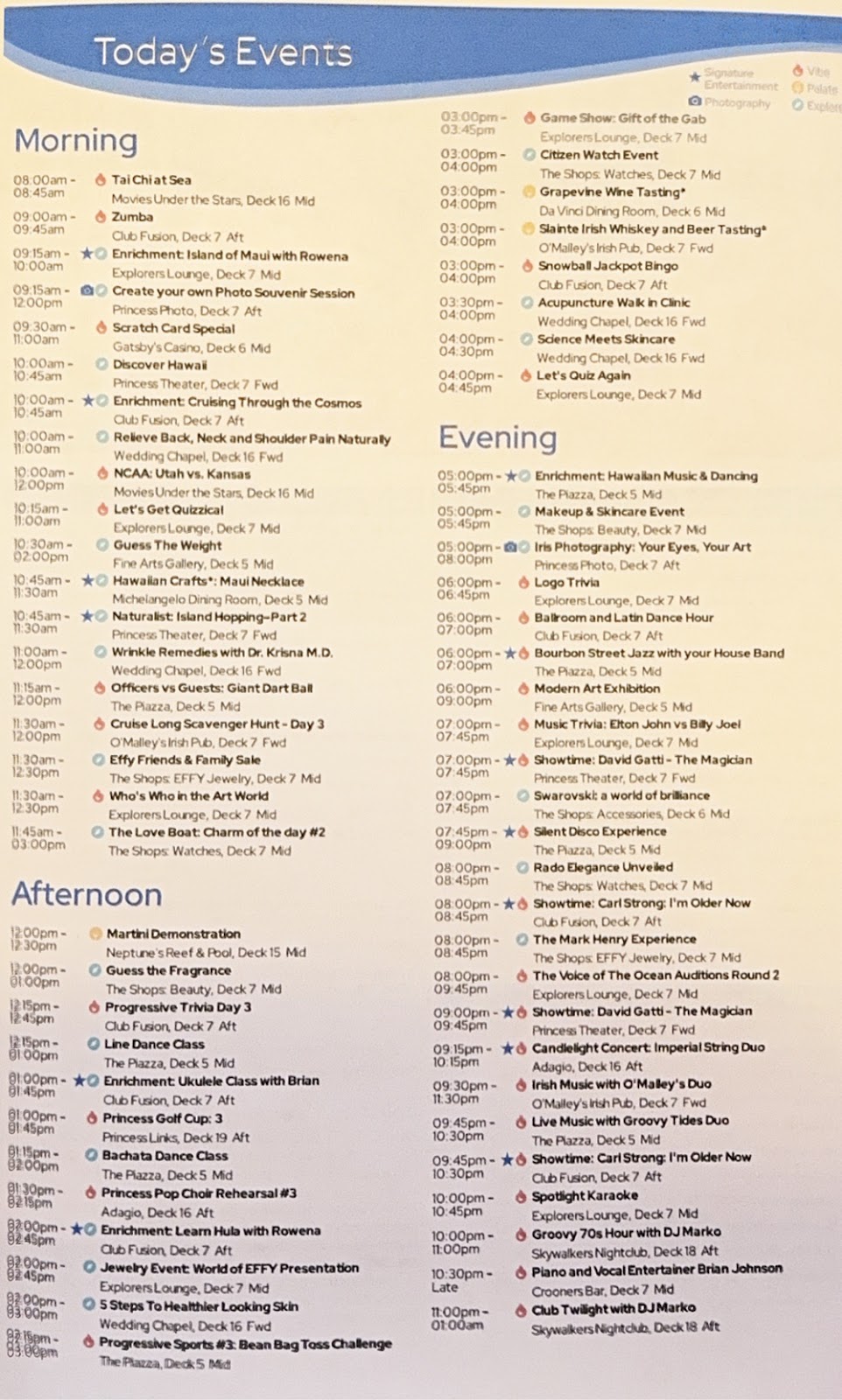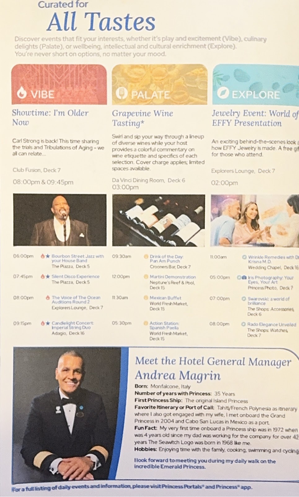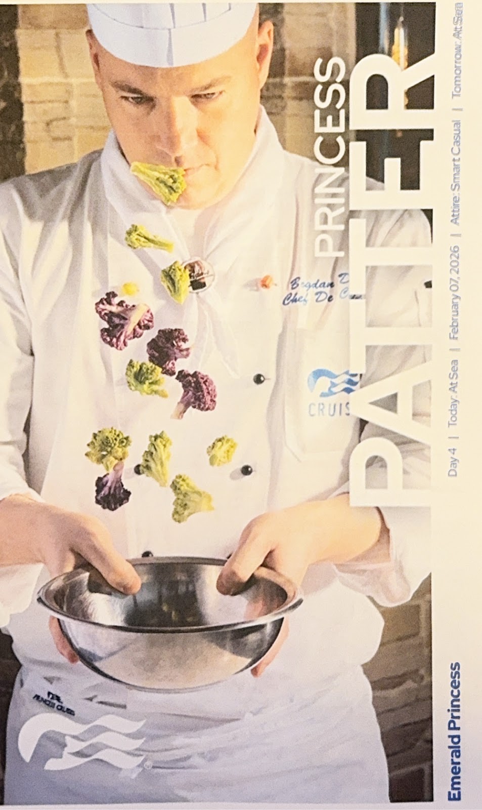 We dressed in our warmest clothes and ate comfort food at dinner and our resulting full bellies made the day seem much better. So did tonight’s Princess Theater show, the return of singer Gen Maldonado who we had seen at the beginning of last cruise. My God, what a voice, what a talent, what an entertainer.