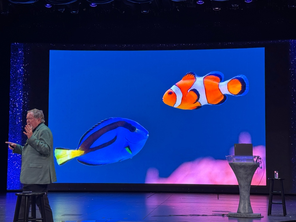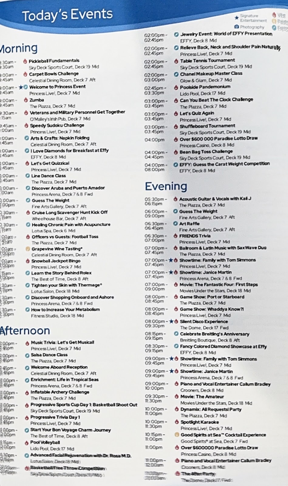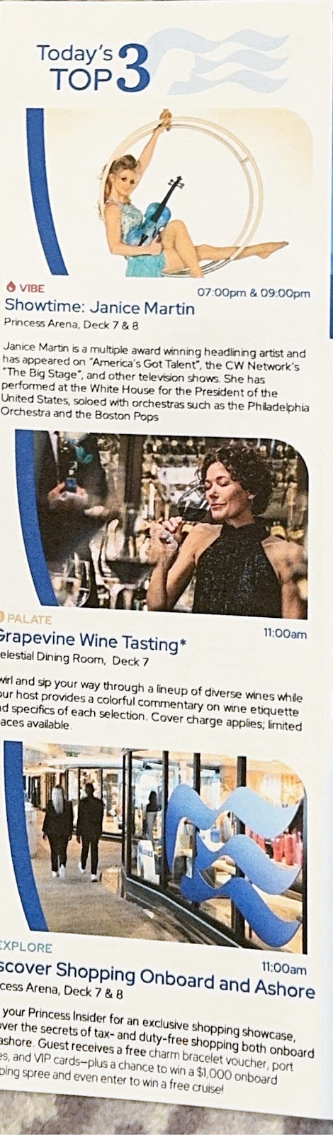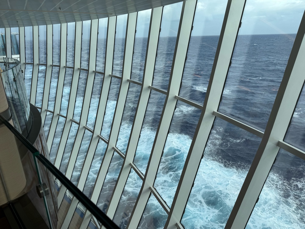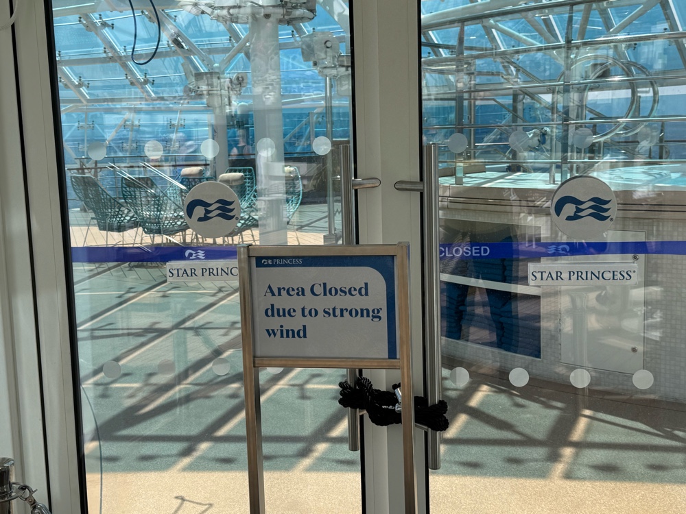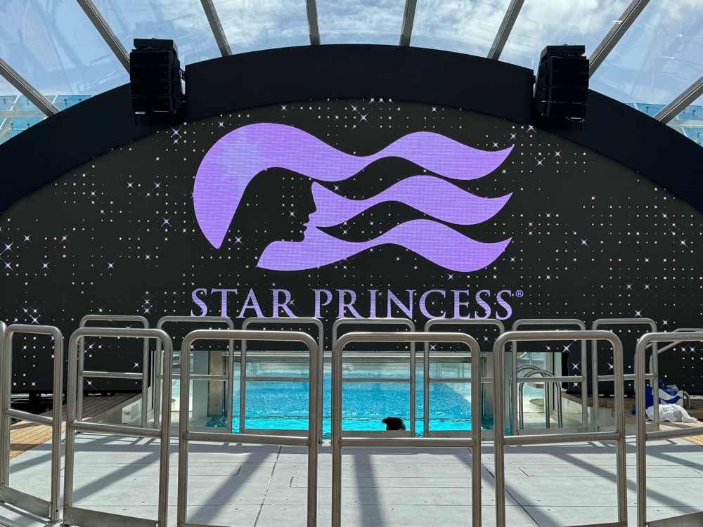 After we finished, we returned to the cabin to recharge our iPhones and let me talk about our cabin. Simply stated, we love it. The storage, though completely different than on other Princess ships, is ample. I can finally see why G gets so irritated at the nine decorative pillows I have on our bed at home. We have five fewer here but they are simply in the way, and because our room can accomodate a third person, that extra bedding is stored under the bed and the pillows won’t fit there. The cabin is smaller than other Princess cabins, but we expected that. Still, it’s large enough, nearly new, with lots of USB-A and -C power ports and fantastic lighting. The bathroom is a wonder, with a much larger shower (laughably larger compared to a Grand Class shower) with a glass door in lieu of a curtain. That alone makes this ship a winner.